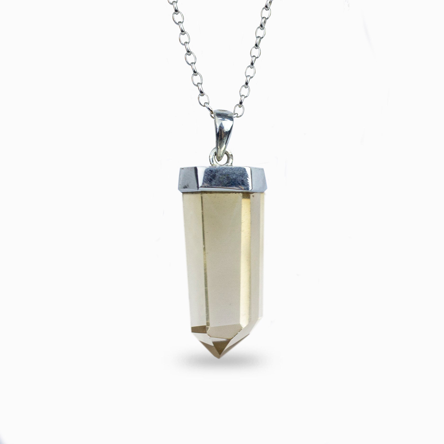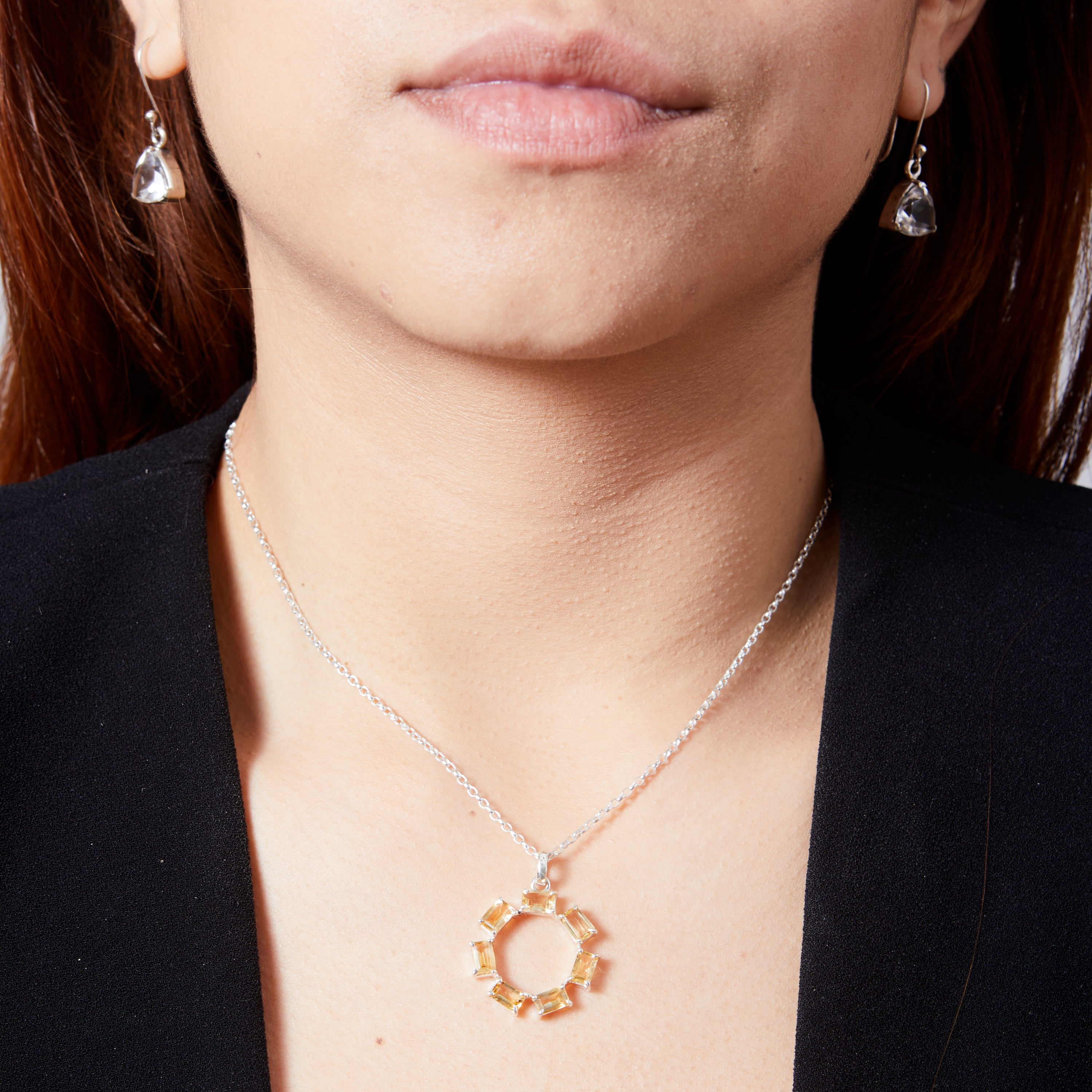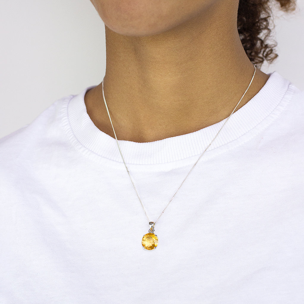 Citrine faceted pendant with sterling silver claw bezel Citrine faceted pendant with sterling silver chain on model