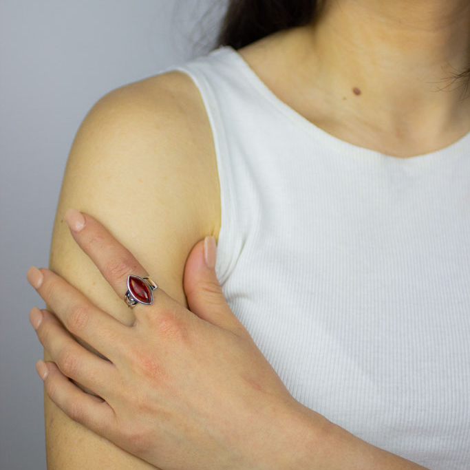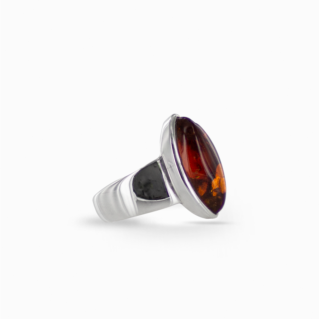 This marquise shaped bezel set Amber ring features deep fire red tones and a patterned band to complement the gorgeous gemstone. This fossilised resin is millions of years old; Amber has held cultural significance for millennia, used in jewellery and art by various civilisations throughout history. The mind, body and spirit is thought to be cleansed by Amber's unique energies.