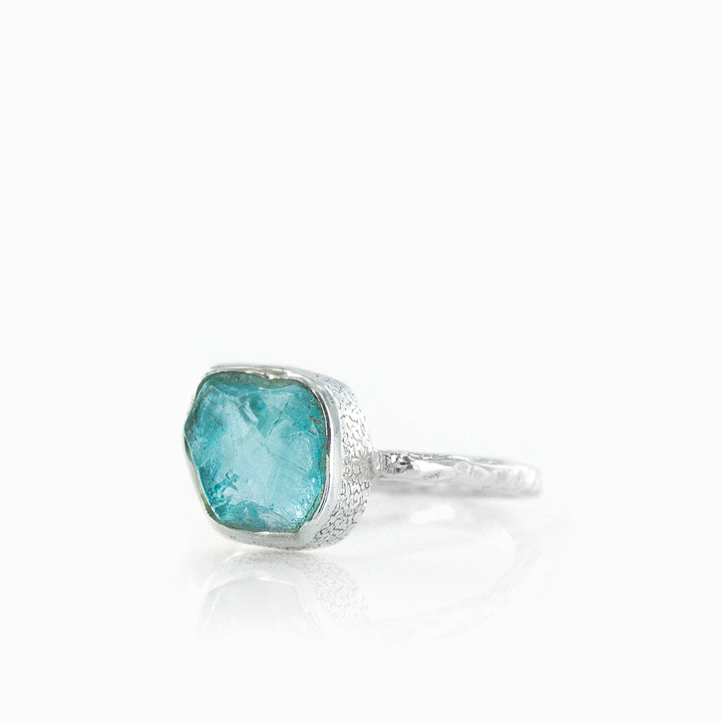 This rough, freeform Apatite ring is a stunning vivid shade of blue, which is reminiscent of the ocean. These tones are enhanced when this ring is in the direct sunlight, bringing out its beauty. Wear this stunning ring with its unique textured band to spice up any outfit. This gemstone is believed to hold the key to the future, providing those who are receptive to it with knowledge and insight.