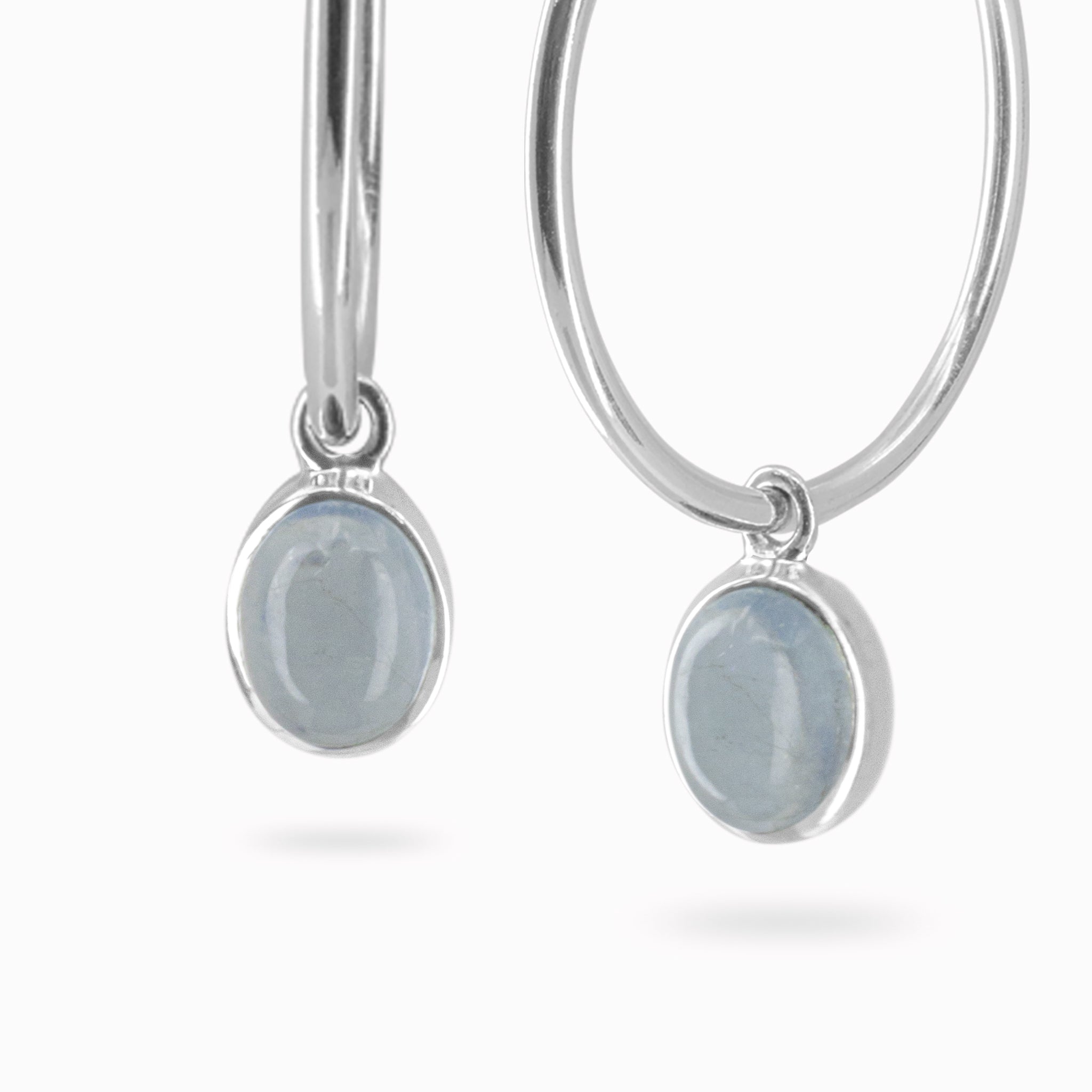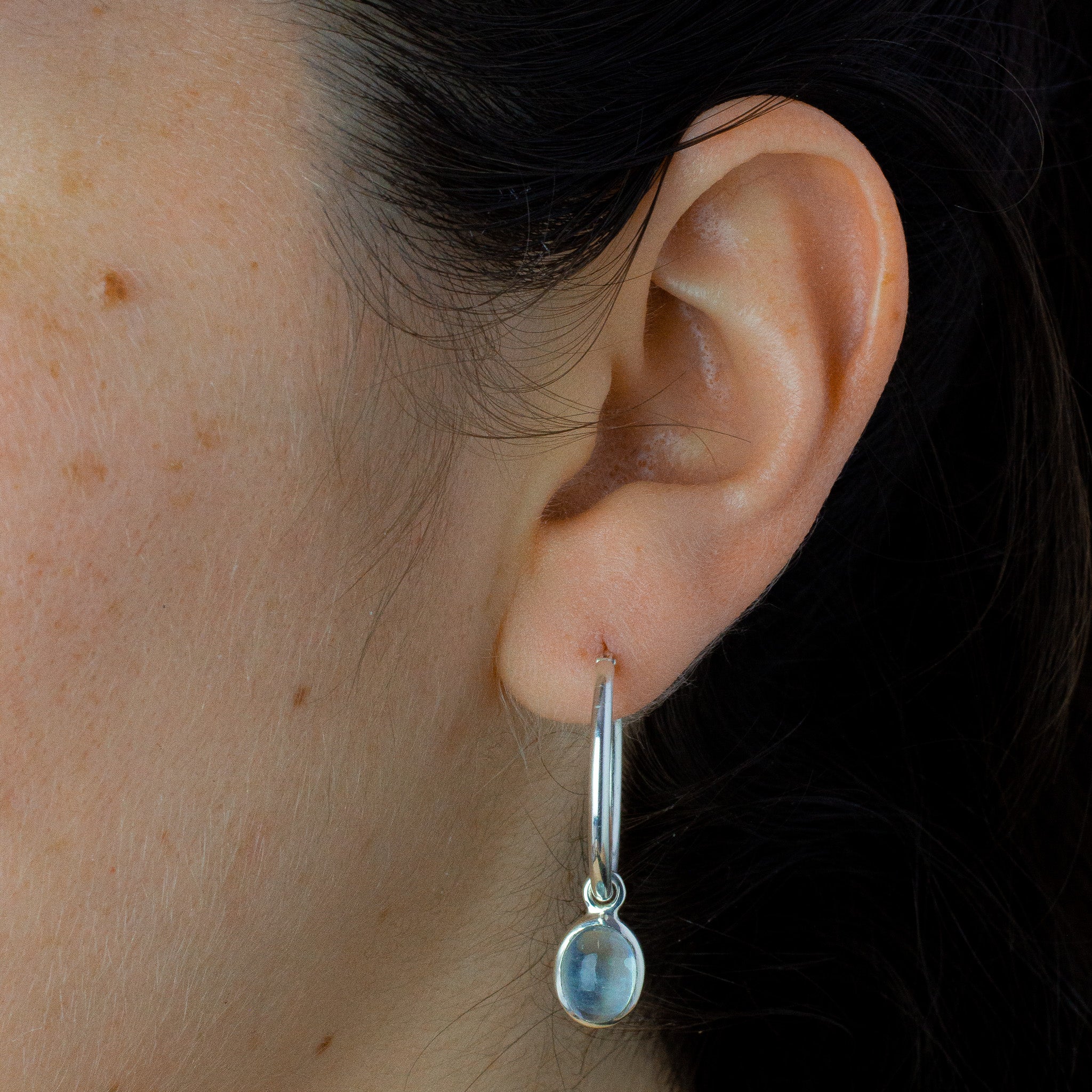 These hoop charms are an oval, cabochon cut Aquamarine, with a beautiful blue tone that is reminiscent of the ocean. These charms are detachable and can be worn on any of our sterling silver hoop sizes.