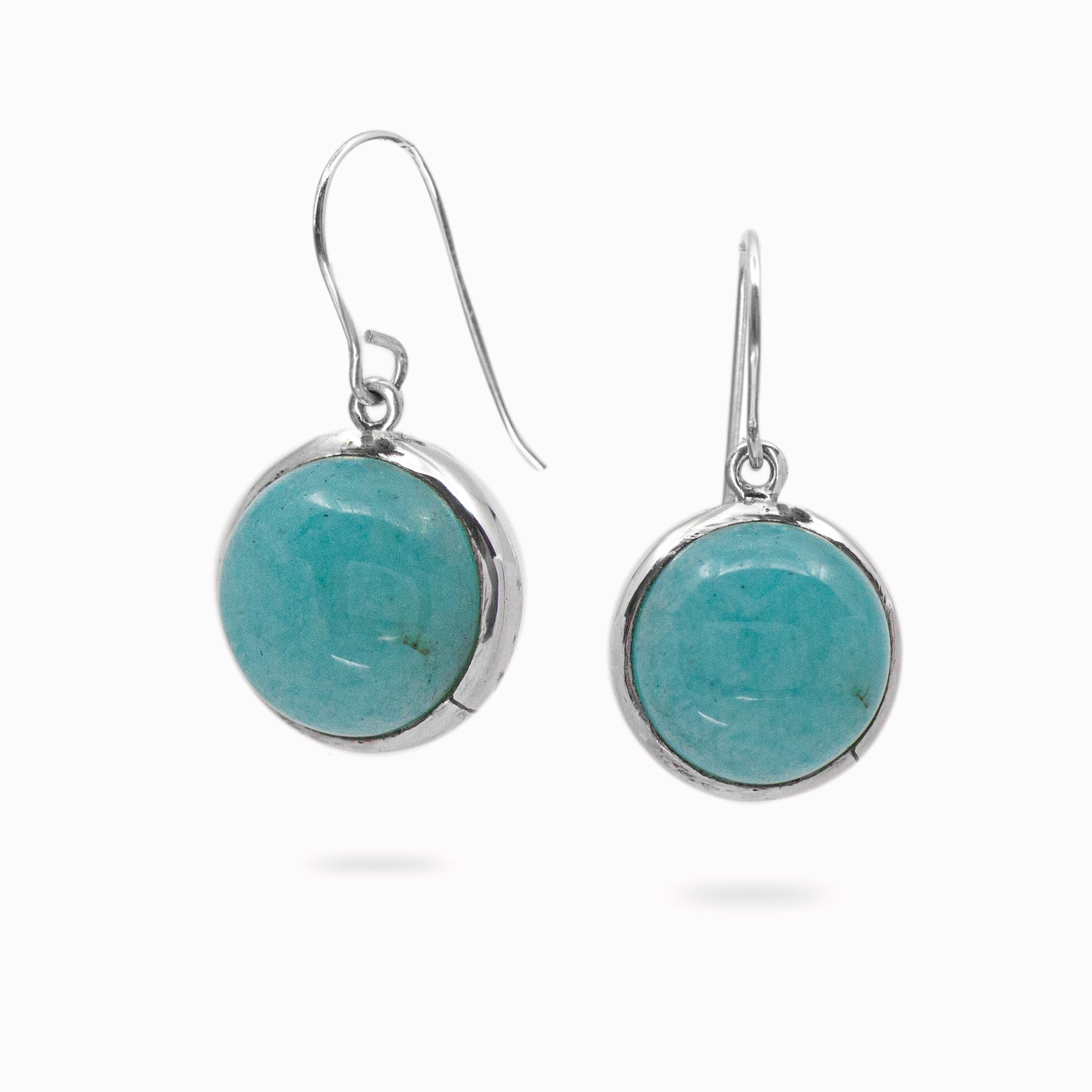 The stunning bright blue of these circular bezel set Amazonite earrings is an eye-catcher. This stone soothes all chakras, eliminating worries and fears and dispels negative energy. It allows the heart and throat chakras to open up, enhancing communications concerning love. Amazonite is also a great stone to wear for general health maintenance.