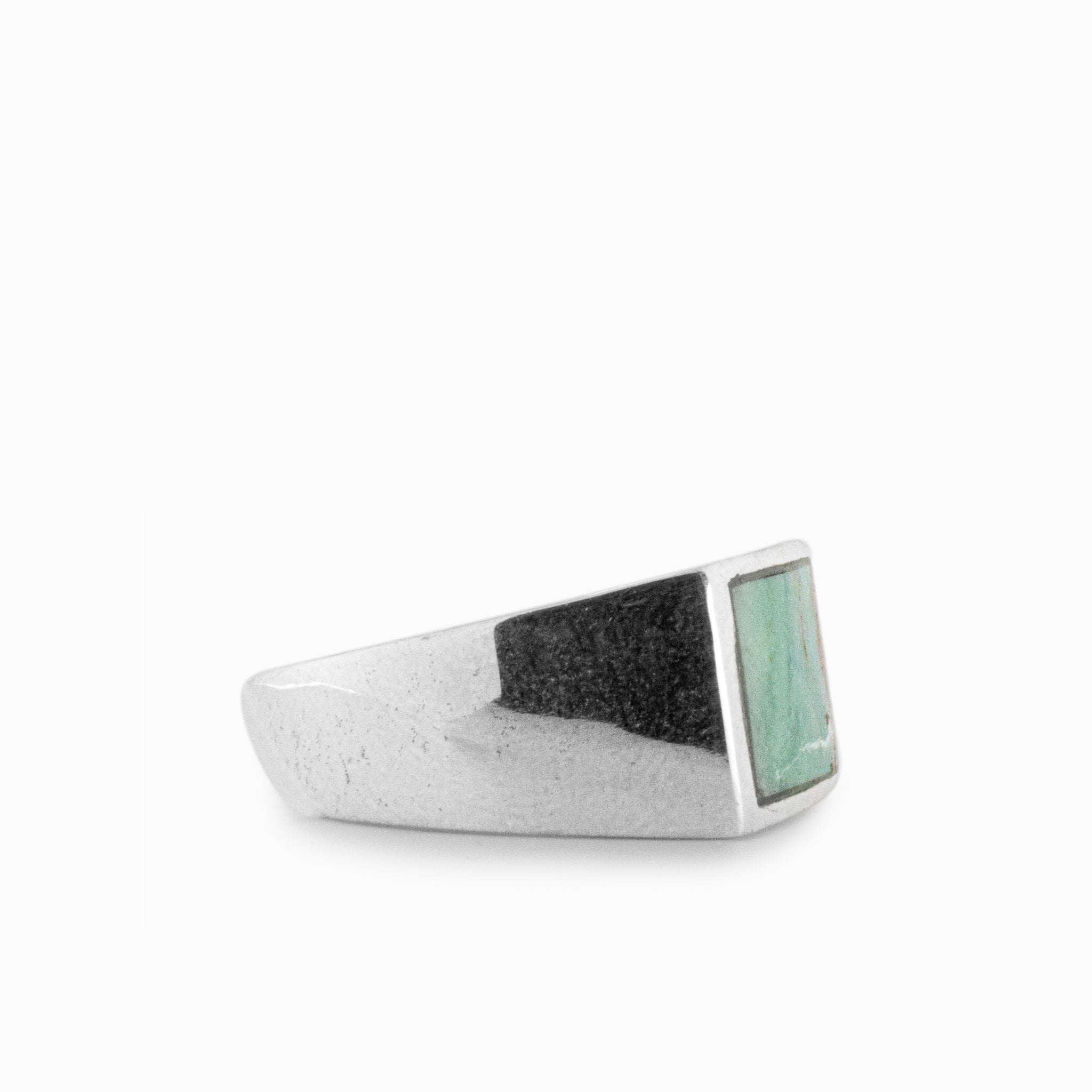 A stunning Campo Frio Turquoise rectangular ring, with a thick band. Campo Frio Turquoise has calm green colours with flecks of dark yellow which will brighten your day and show your individual flair. Handcrafted with care to fit every occasion.