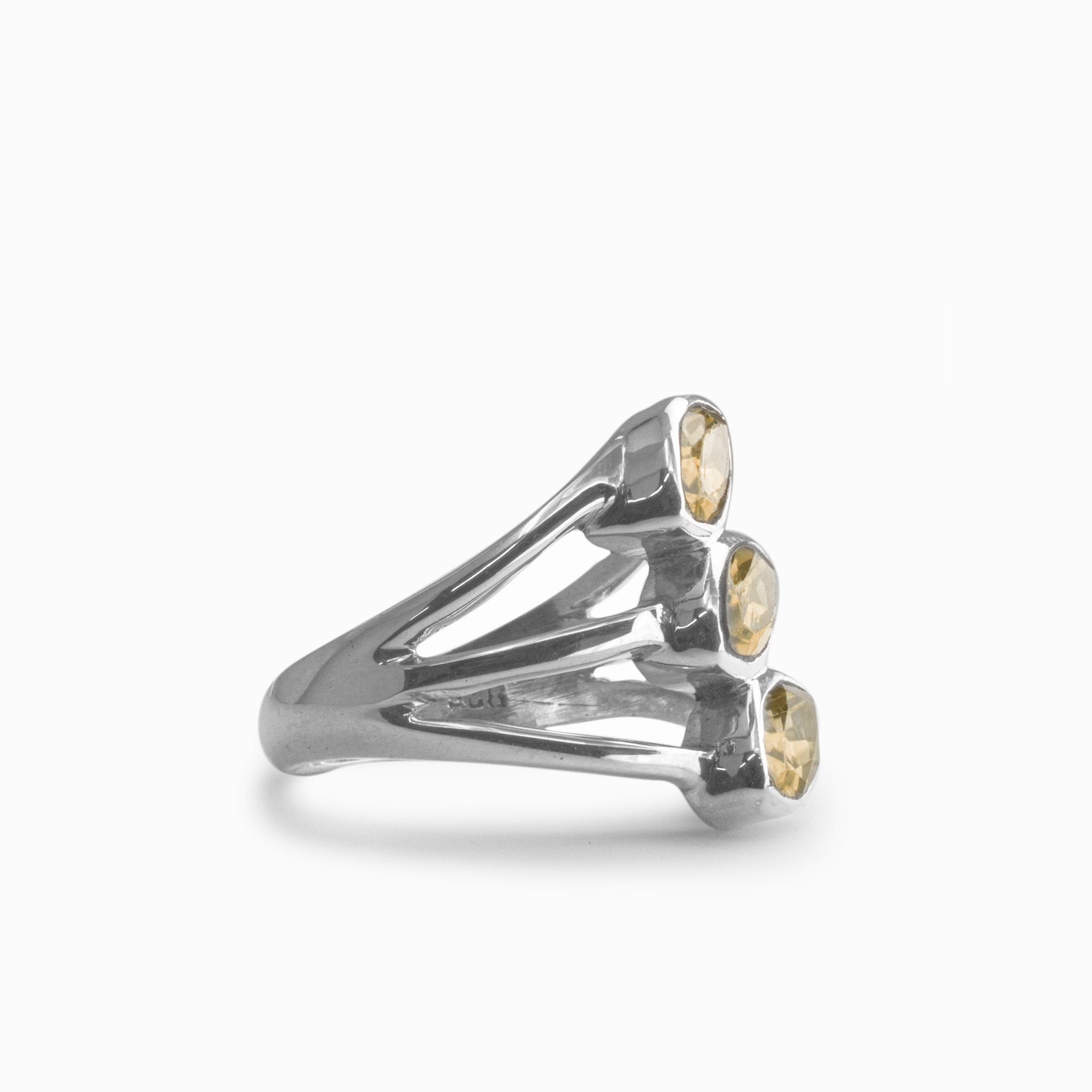 A three tiered, decorative Citrine ring with marquise shaped faceted gemstones.