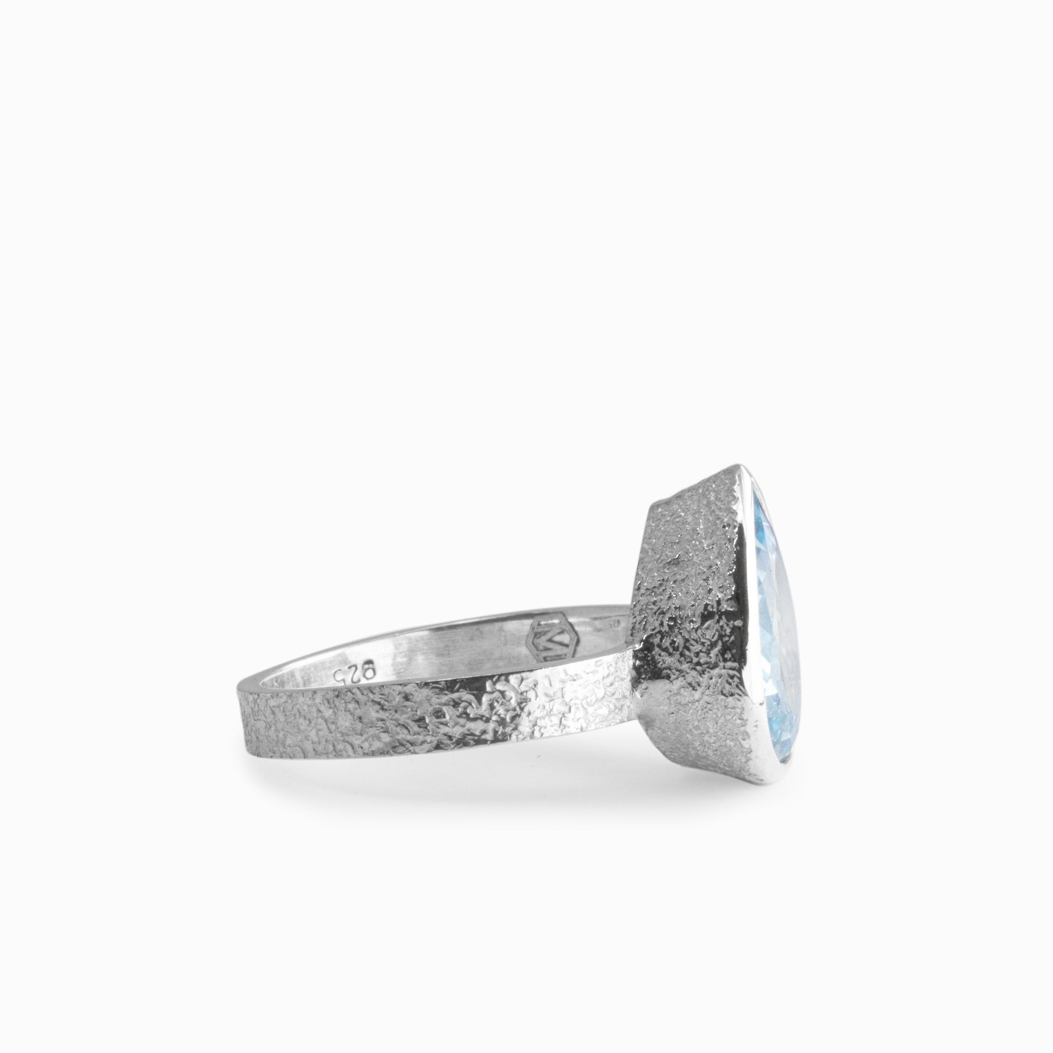 This beautiful teardrop Blue Topaz ring has a hammered band and a faceted cut gemstone, making it shimmer and sparkle. This sky blue crystal can be paired with any colour.