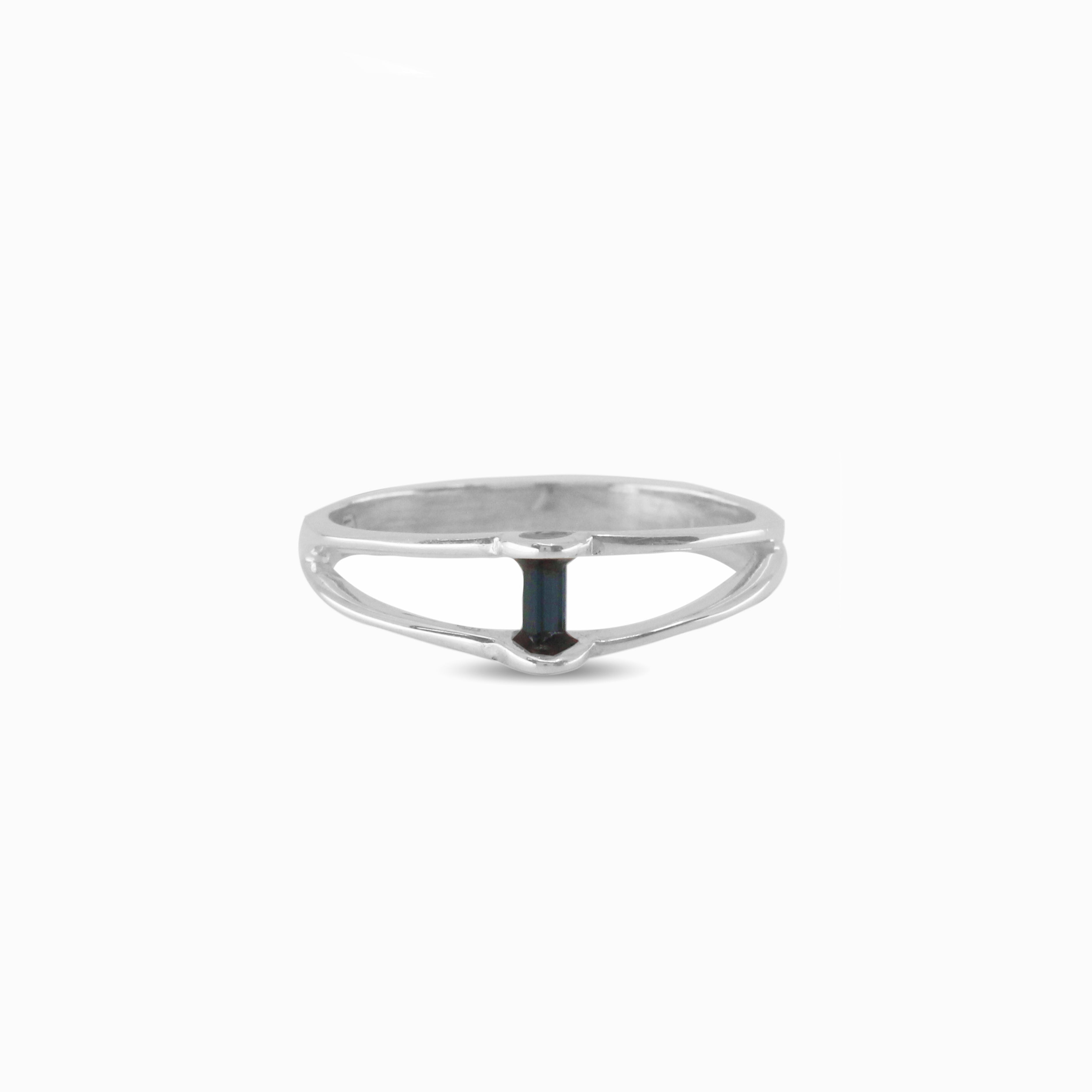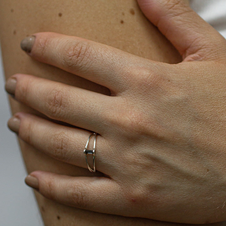 A delicate split banded ring with a rectangular Blue Tourmaline gemstone. This style is unique yet easy to pair with other styles.