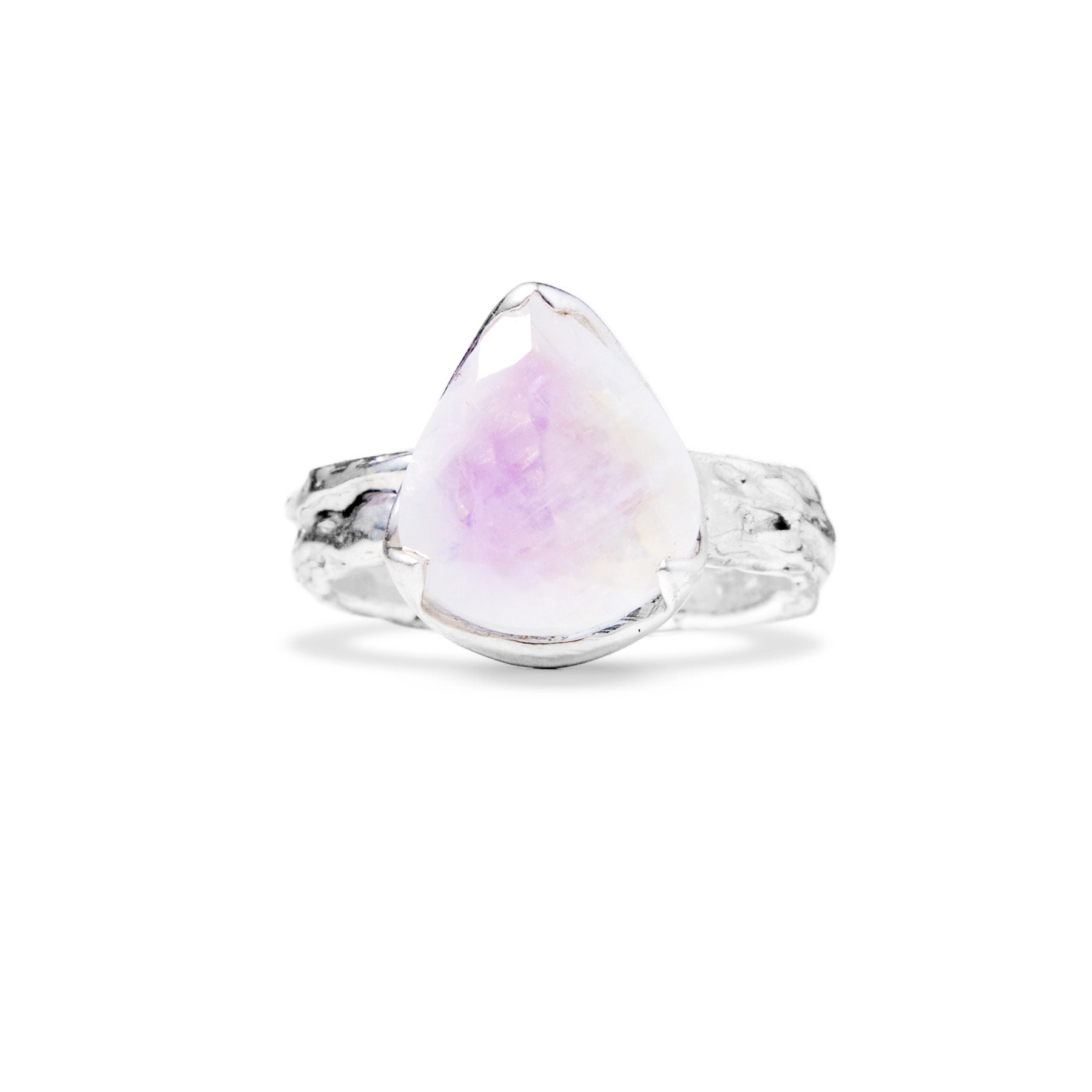 A dreamy white stone with billowy blue flashes of colour, Rainbow Moonstone is adored from every angle in this delicate ring design. This gem will compliment any look with any stone for any occasion. The stone of new beginnings, this gem is also the traveller’s stone, a staple in any collection.