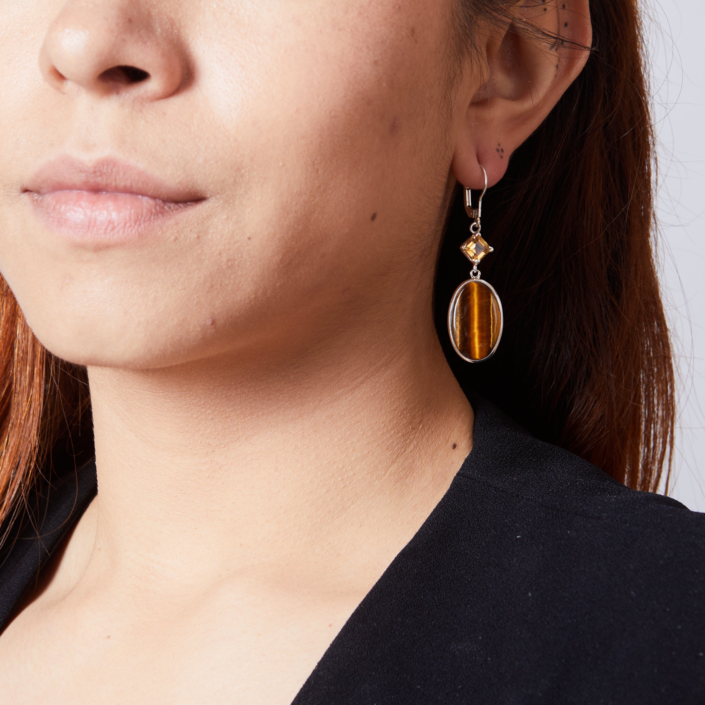 These stunning earrings showcase the beauty of fibrous Tiger Eye, with its silky surface that reflects light in a way that seems almost alive. The stone's sleek, polished appearance and sun-kissed colors bring the energy of both sand and sunlight, blending the forces of the Earth and the Sun. Tiger Eye is known for its grounding properties, bringing a sense of lightness, optimism, and practical awareness to its wearer. Adding to their charm, these earrings feature square citrine faceted gems, enhancing the design with a touch of golden warmth and brightness. Together, the Tiger Eye and citrine bring a harmonious balance of energy, style, and positive vibration.