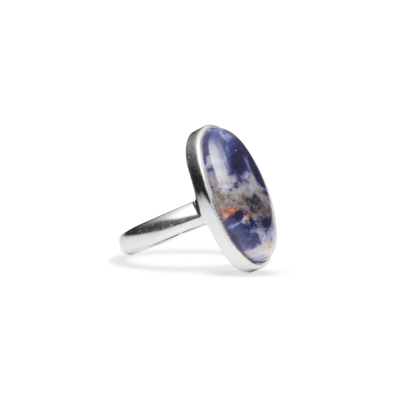 This gem's range of dark blue colours is particularly unique. This deep blue beauty looks stunning against white and bright colours, but will still appear glam against deeper hues. This Sodalite gemstone ring gives the wearer the ability to reason and develop logical conclusions. It aids in the removal of confusion, allowing one to utilize intelligence in all situations and providing a sense of purpose with a light heart. It can also be used to help people recognise and express their true emotions.