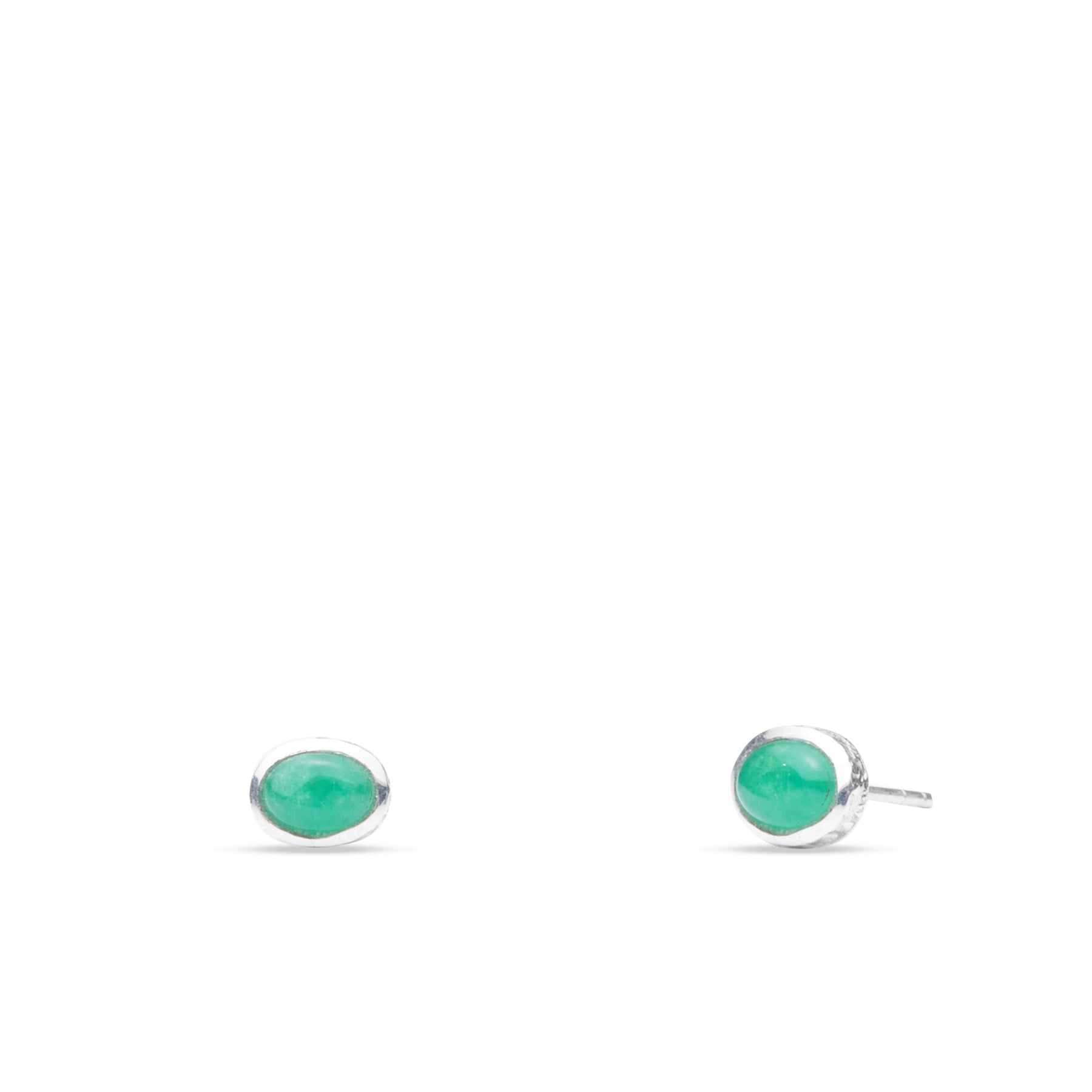 An everyday pair of oval Chrysoprase stud earrings with a cabochon cut and hammered bezel setting. Chrysoprase is believed to promote adaptability and self-acceptance. This gemstone was also well-known in history, having been worn as a good luck charm on Alexander the Great's belt and by Cleopatra, who believed it assisted her in maintaining her youthful beauty.