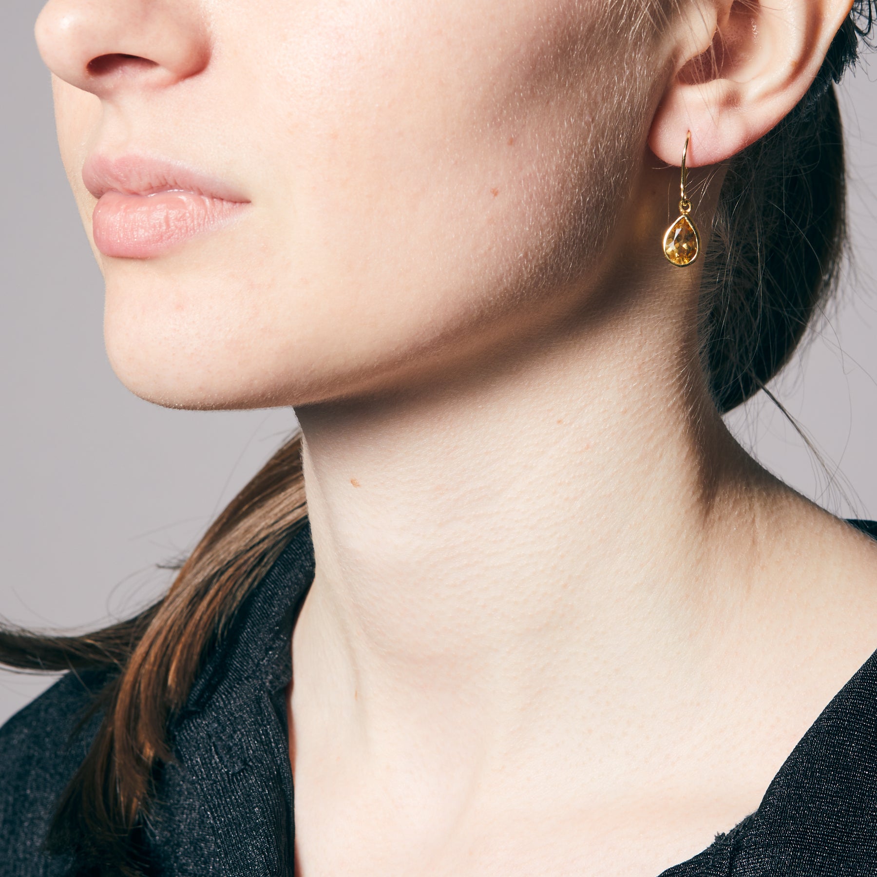 A stunning simple pair of drop earrings with teardrop faceted Citrine gemstones. This golden variety of Quartz is the perfect gem to wear day or night and transform any style. Known as the stone for wealth and abundance. Carrying the power of the sun, this mineral does not hold and accumulate negative energy therefore this stone never needs cleansing.