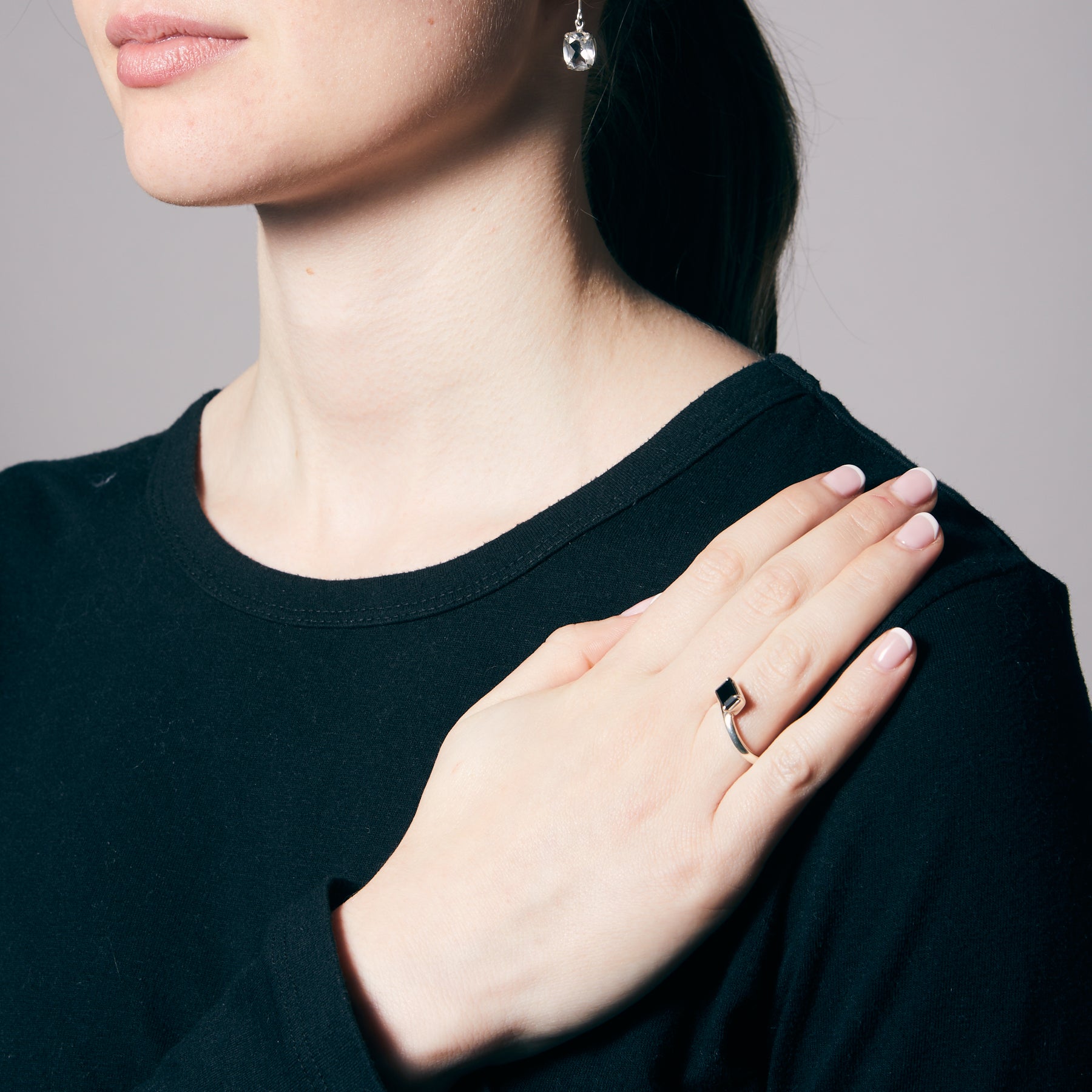 Bold, refined, and unapologetically sleek, this sterling silver ring features a striking emerald-cut black onyx, cradled in a minimal four-prong setting. The band curves gently into a soft V-shape, giving the piece an classic edge while drawing the eye straight to the stone. Known as a grounding and protective gem, black onyx is said to absorb negative energy and promote strength and clarity. Wear it as a modern statement or a daily anchor, either way, it’s a powerful addition to your collection.