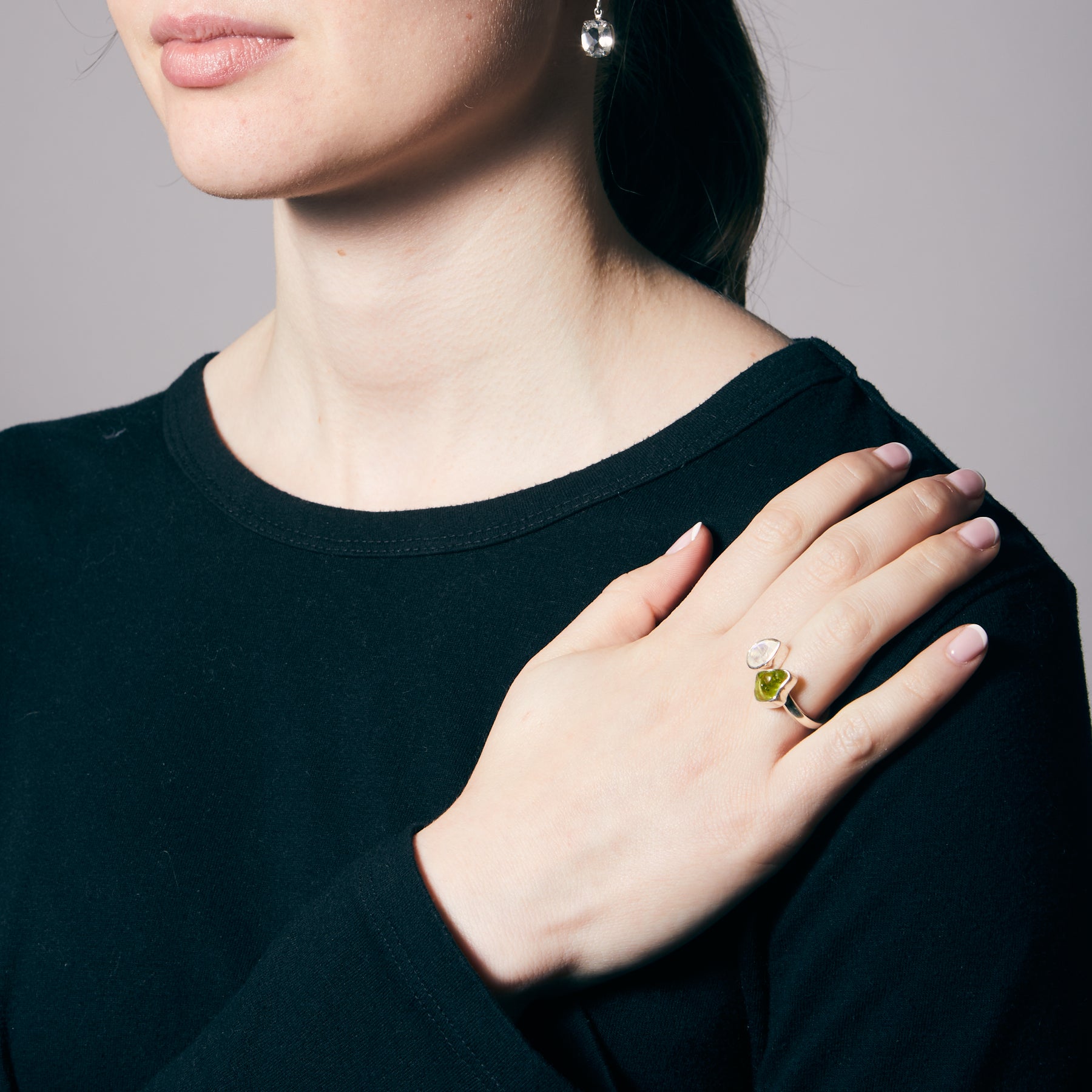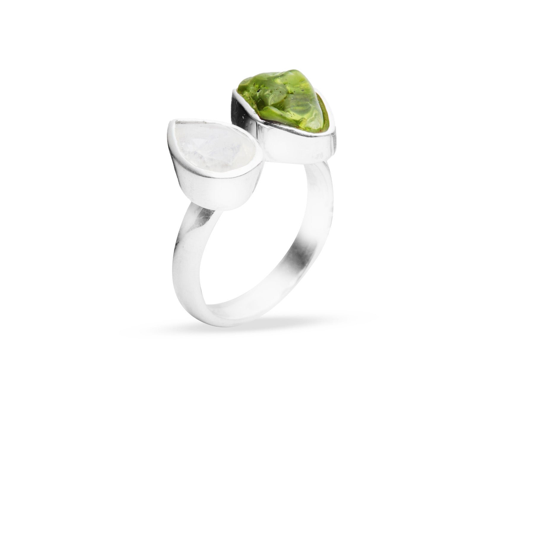 This unique ring brings together the vivid energy of rough peridot and the soft, ethereal glow of a faceted moonstone teardrop. Set side by side in smooth bezel settings, the pairing creates a beautiful contrast between raw texture and refined sparkle. Peridot is associated with renewal and abundance, while moonstone is known for its calming and intuitive qualities. Together, they offer a harmonious balance of strength and serenity, making this ring both meaningful and visually captivating.