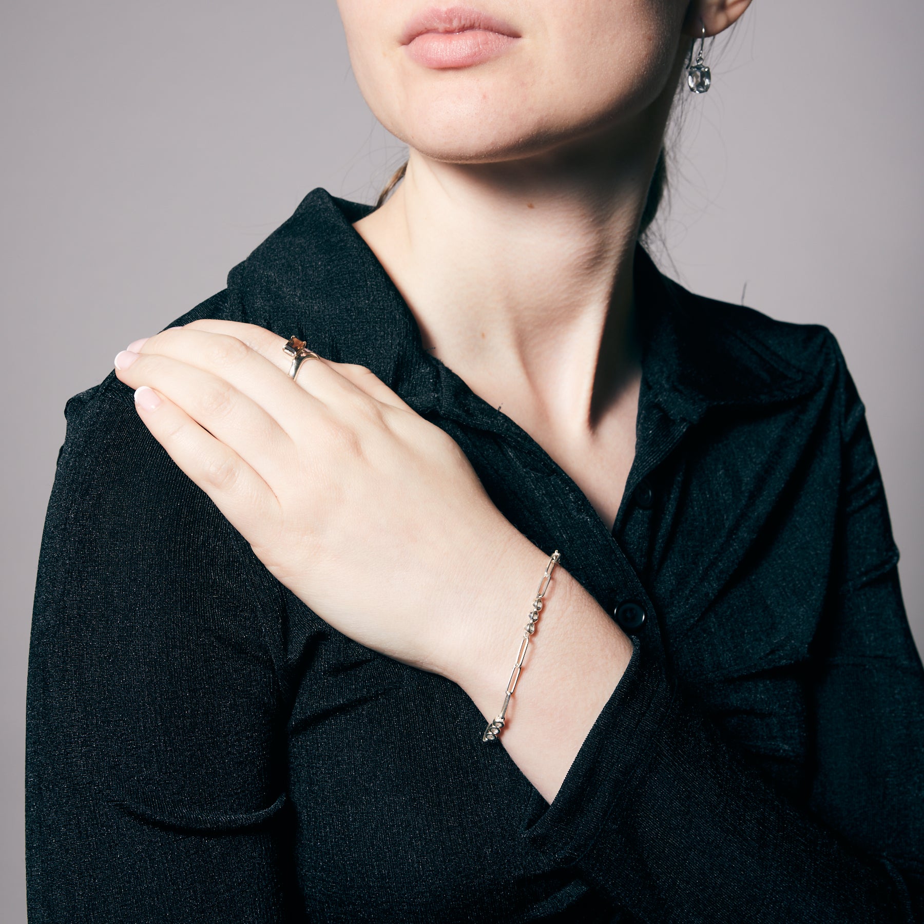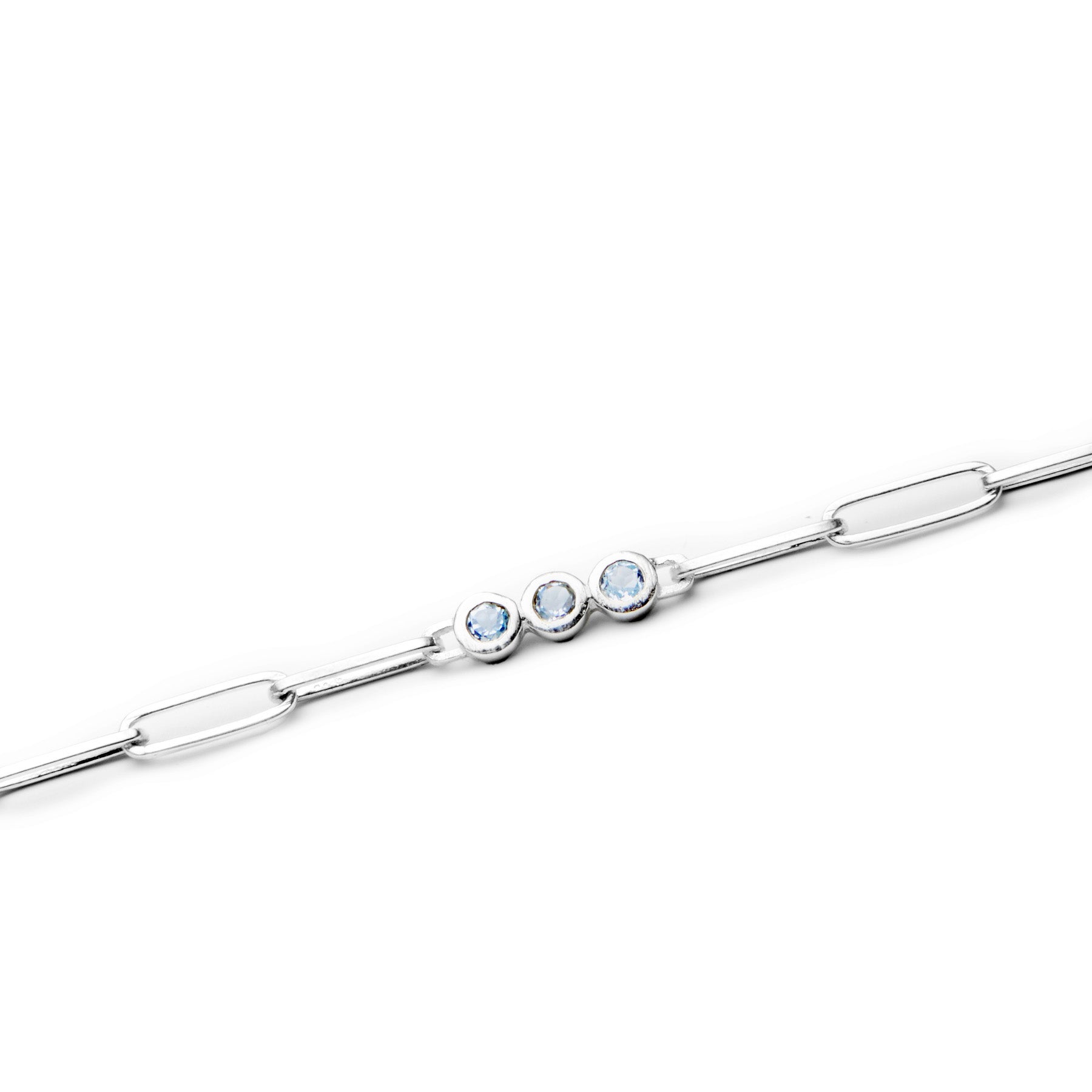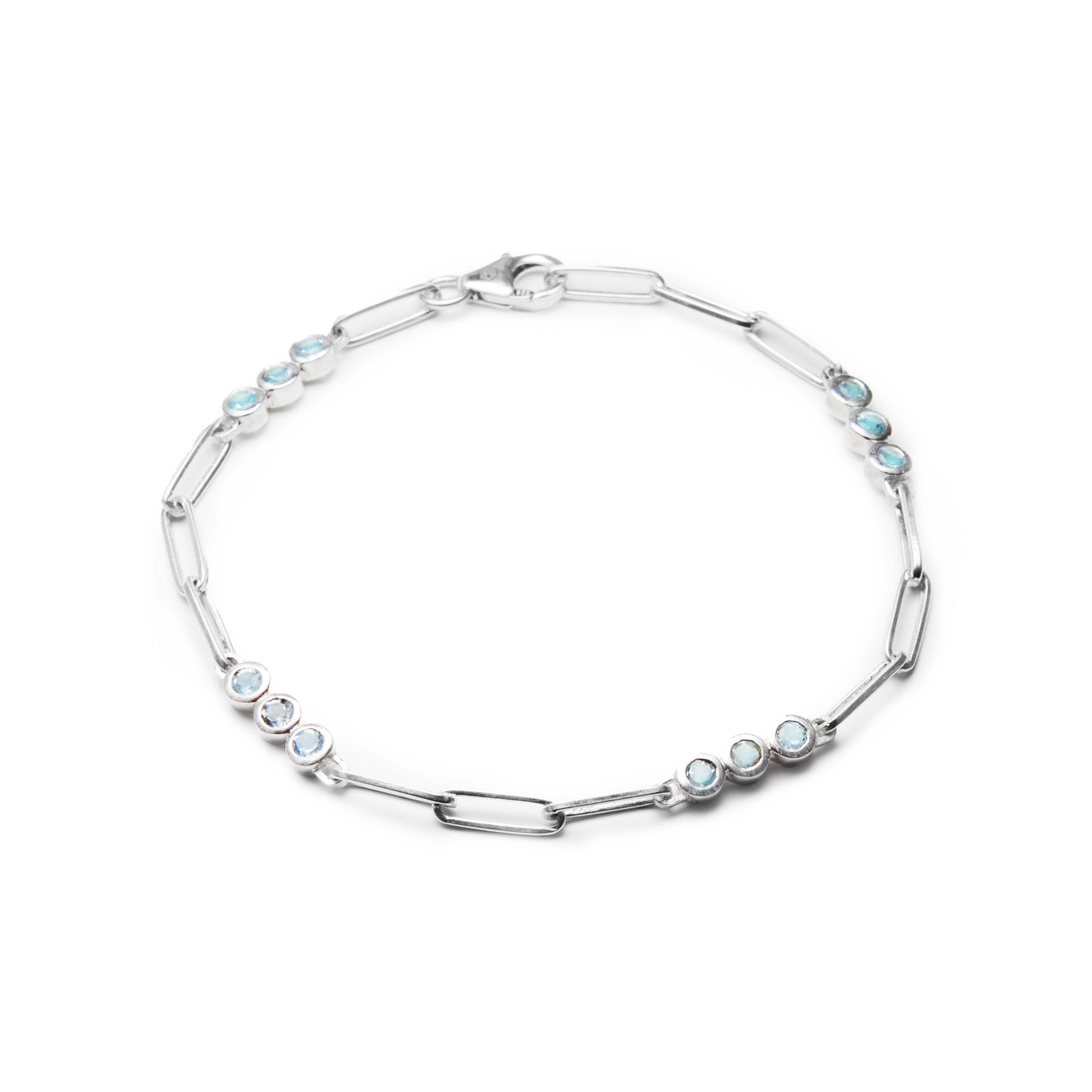 This modern bracelet blends clean design with the natural brilliance of blue topaz. Faceted blue topaz gemstones are bezel set in a delicate sequence along a contemporary sterling silver paperclip chain. The bright, sky-blue tones of the stones sparkle brilliantly in the light, offering a refined pop of colour without overwhelming. Blue topaz is known for its uplifting and soothing energy, said to inspire creativity, calm the mind, and promote clear expression. Light, versatile, and effortless to wear, this piece layers beautifully or stands out all on its own.