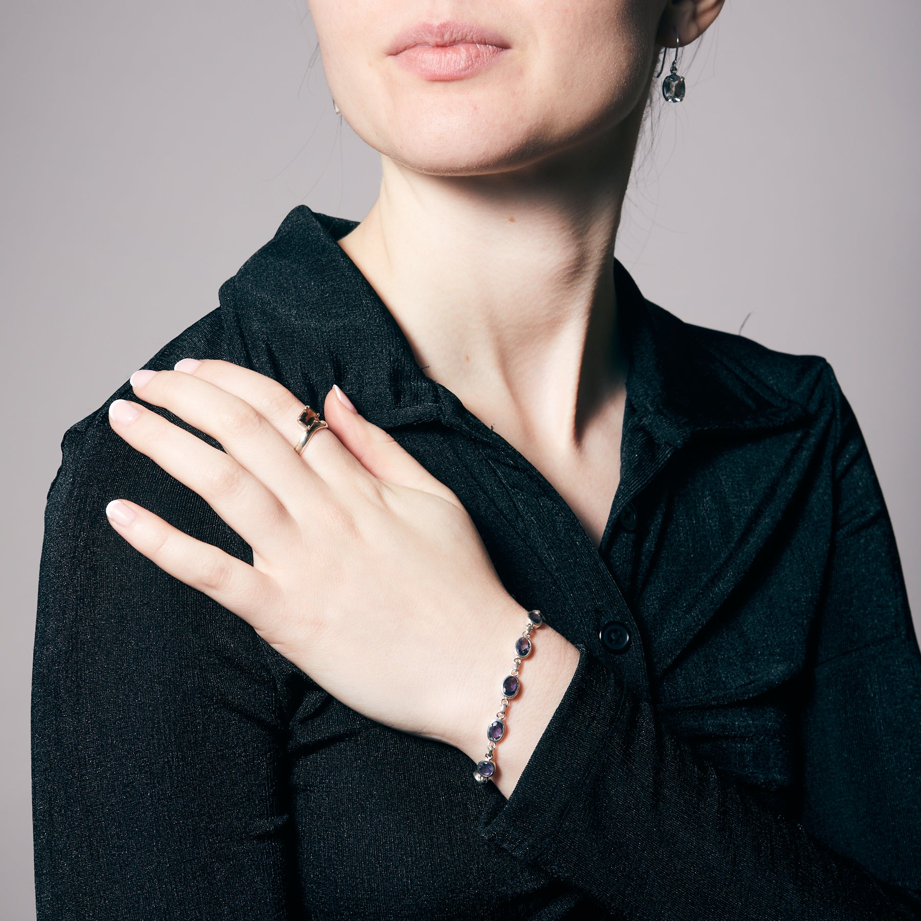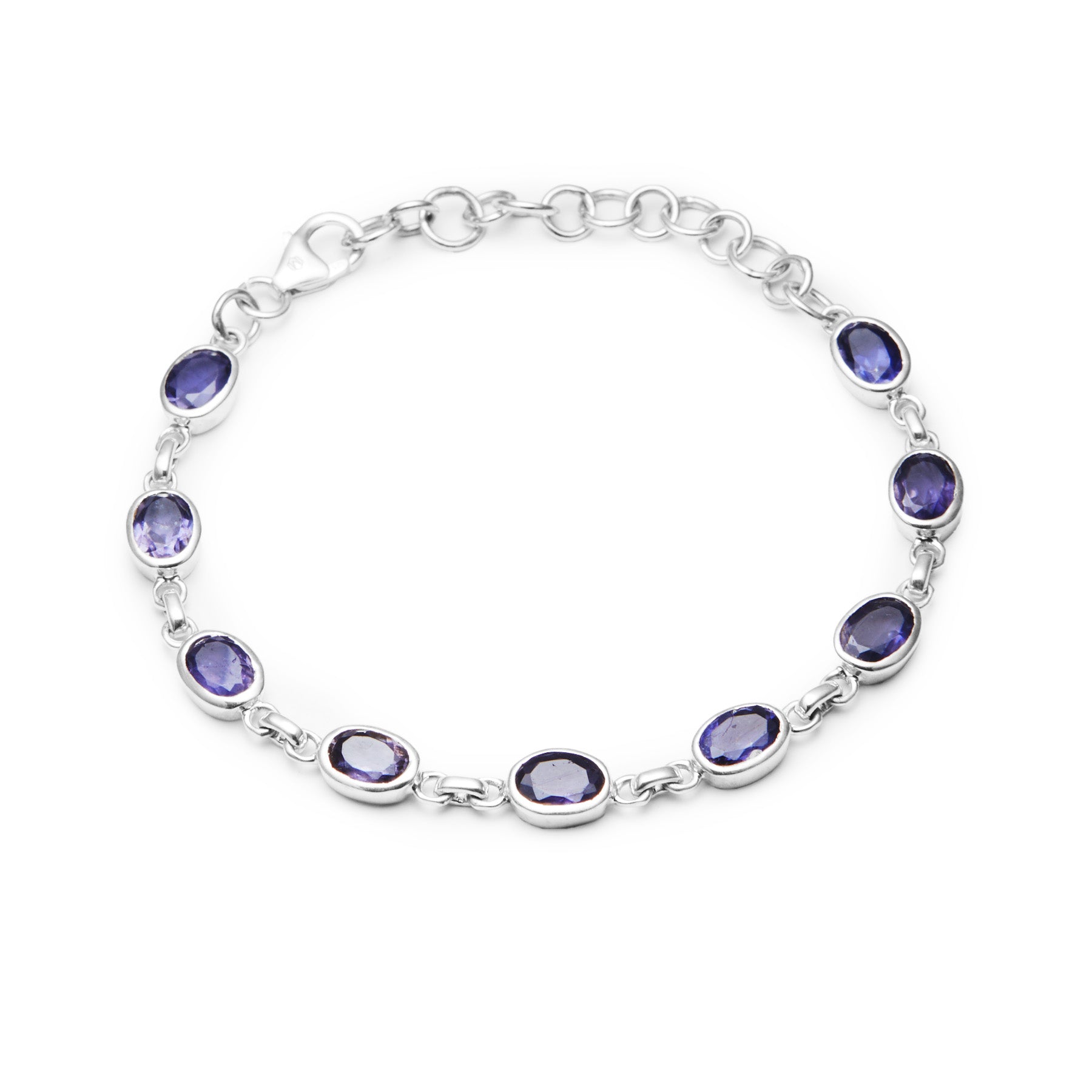 Elegant and understated, this bracelet is crafted with a sequence of oval faceted Iolite gemstones, each bezel set in polished sterling silver. The deep, inky blue of the Iolite shimmers with subtle violet undertones, creating a refined yet striking effect. Iolite is known as a stone of inner vision and self-responsibility, believed to guide the wearer toward clarity and success. Whether worn alone or layered, this bracelet adds a sophisticated touch to any outfit and pairs especially well with cool tones and neutrals. A timeless piece for those drawn to quiet confidence and intuitive strength.