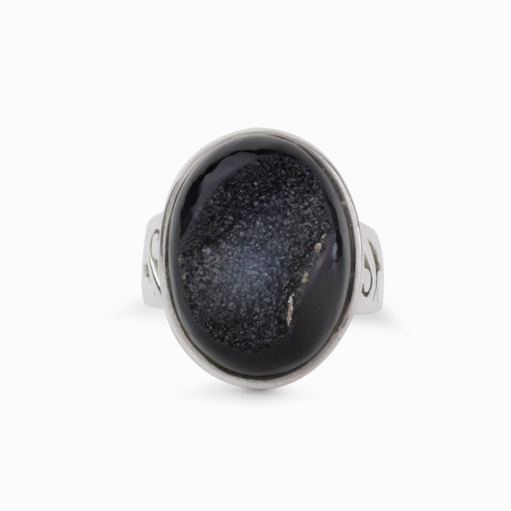 This beautiful druzy Black Onyx oval ring shows an interesting slice of the raw stone, which glitters when the light hits it. Featuring a filigree band, this ring has the perfect decorative effect, which can jazz up any outfit.