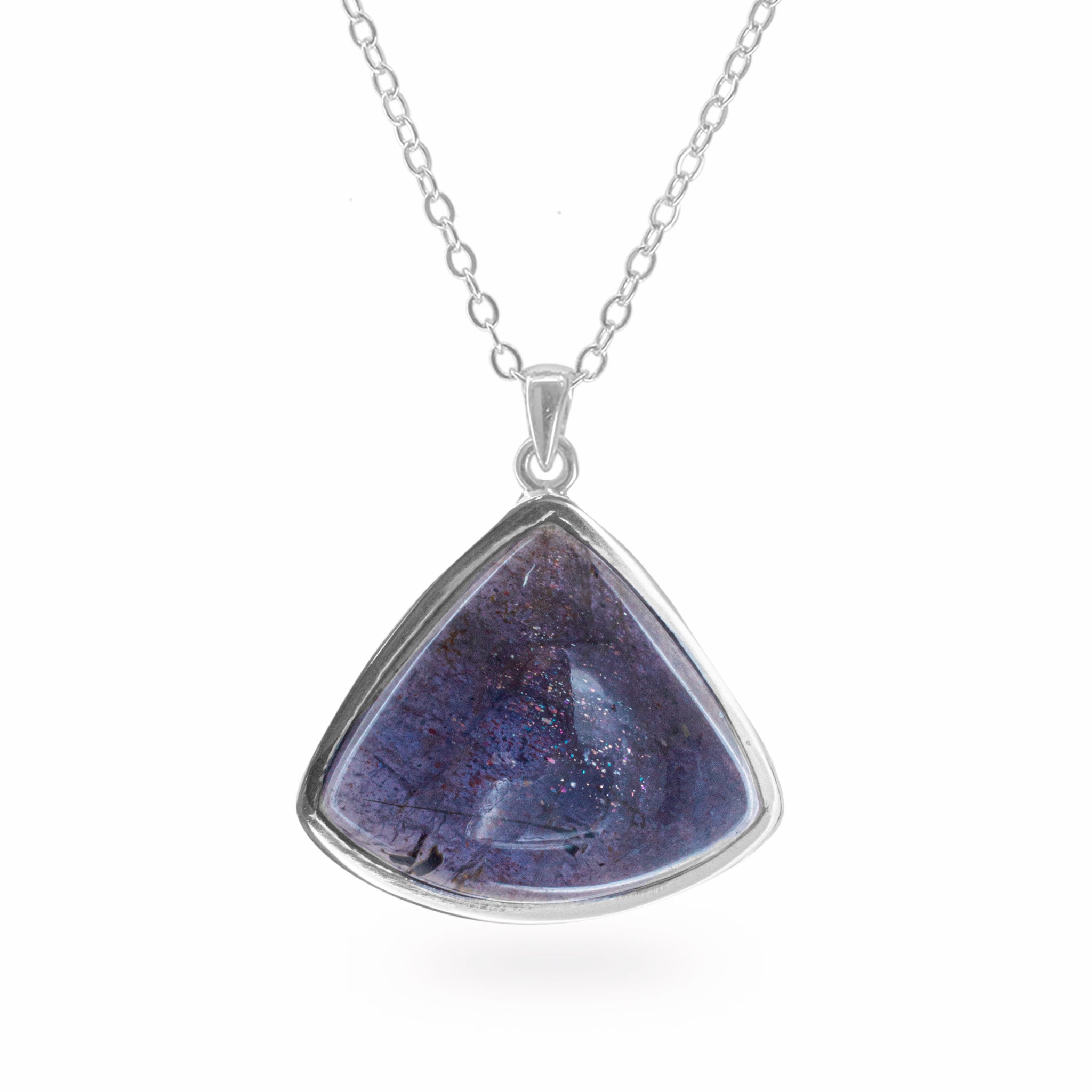 The sparkling transparency of Iolite, which has a unique blue-violet tint when held in the light, adds an elegance to any attire. This cabochon triangular necklace looks great with black or white, but it truly stands out when mixed with different colours.