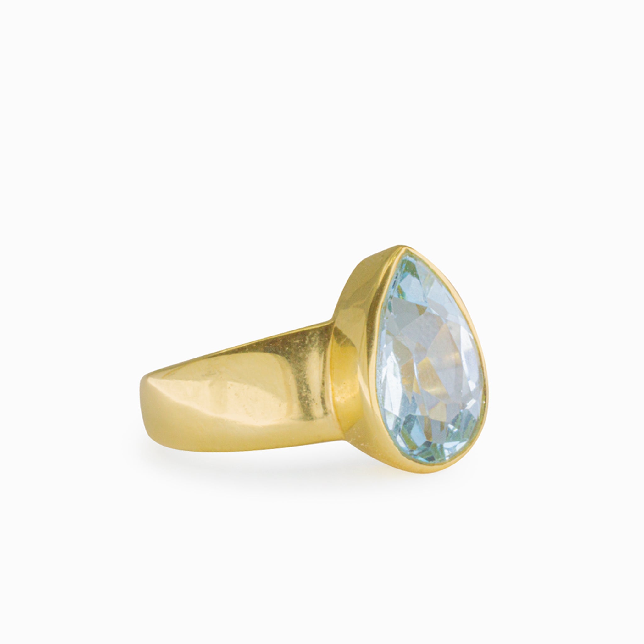 This beautiful teardrop faceted Blue Topaz ring has a bezel setting, and a 14k vermeil finish, which compliments the bright shade of blue.