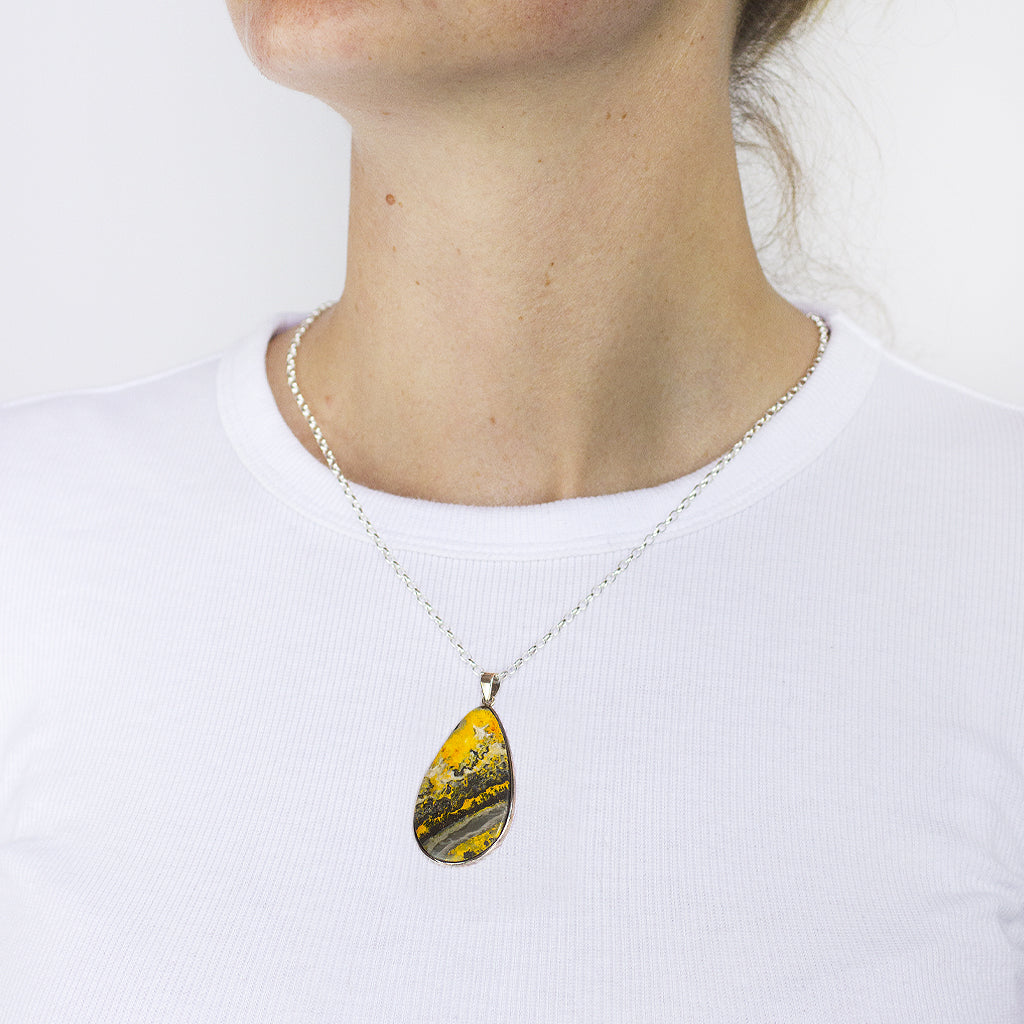 A vibrant yellow necklace with a teardrop shape, reminiscent of a Bumble Bee. Stunning natural patterns contrast the bright yellow and give an interesting look. Worn with black, grey or white, the patterns on Bumble Bee Jasper nearly come to life, catching the eye of all who see. This stone helps one to accept change, find new opportunities and increase self-confidence.