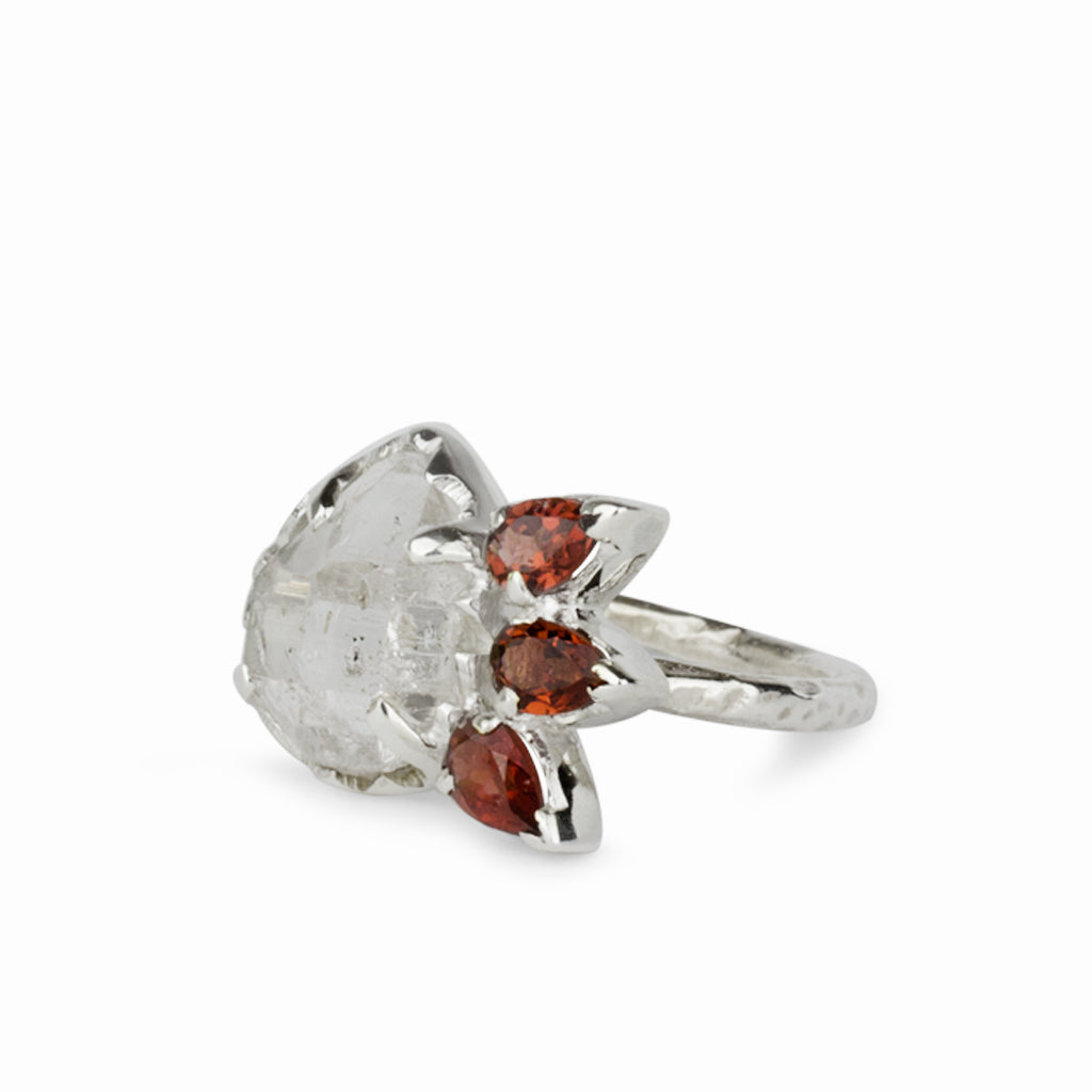 This gorgeous and unique design combines both Herkimer Diamond, The "stone of new beginnings and attument" and Garnet, The "stone of health" This gorgeous ring will add a touch of edge and also elegance to any outfit and can be worn from day to night.