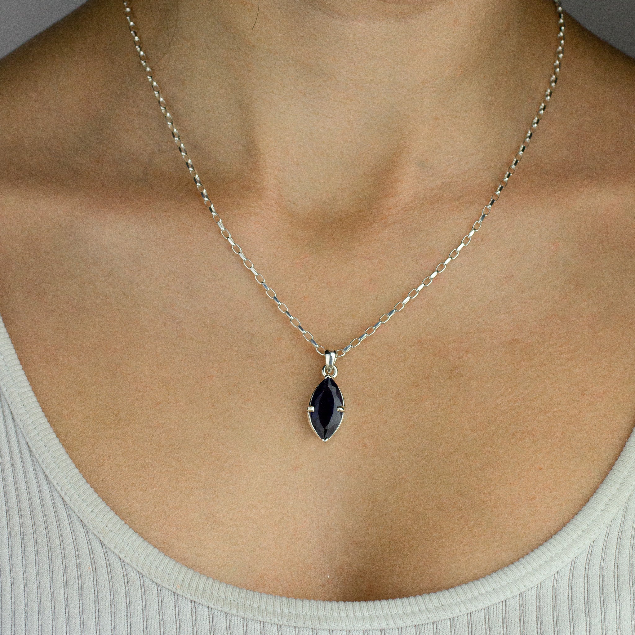 Iolite is a stunning gemstone with a deep blue hue and violet undertones. This faceted necklace compliments black or white outfits, but it also pops when paired with cool tones. The sparkling jewel adds a touch of elegance to any look. Iolite activates both the crown and third eye chakras, promoting debt reduction and self-accountability, which ultimately leads to success.
