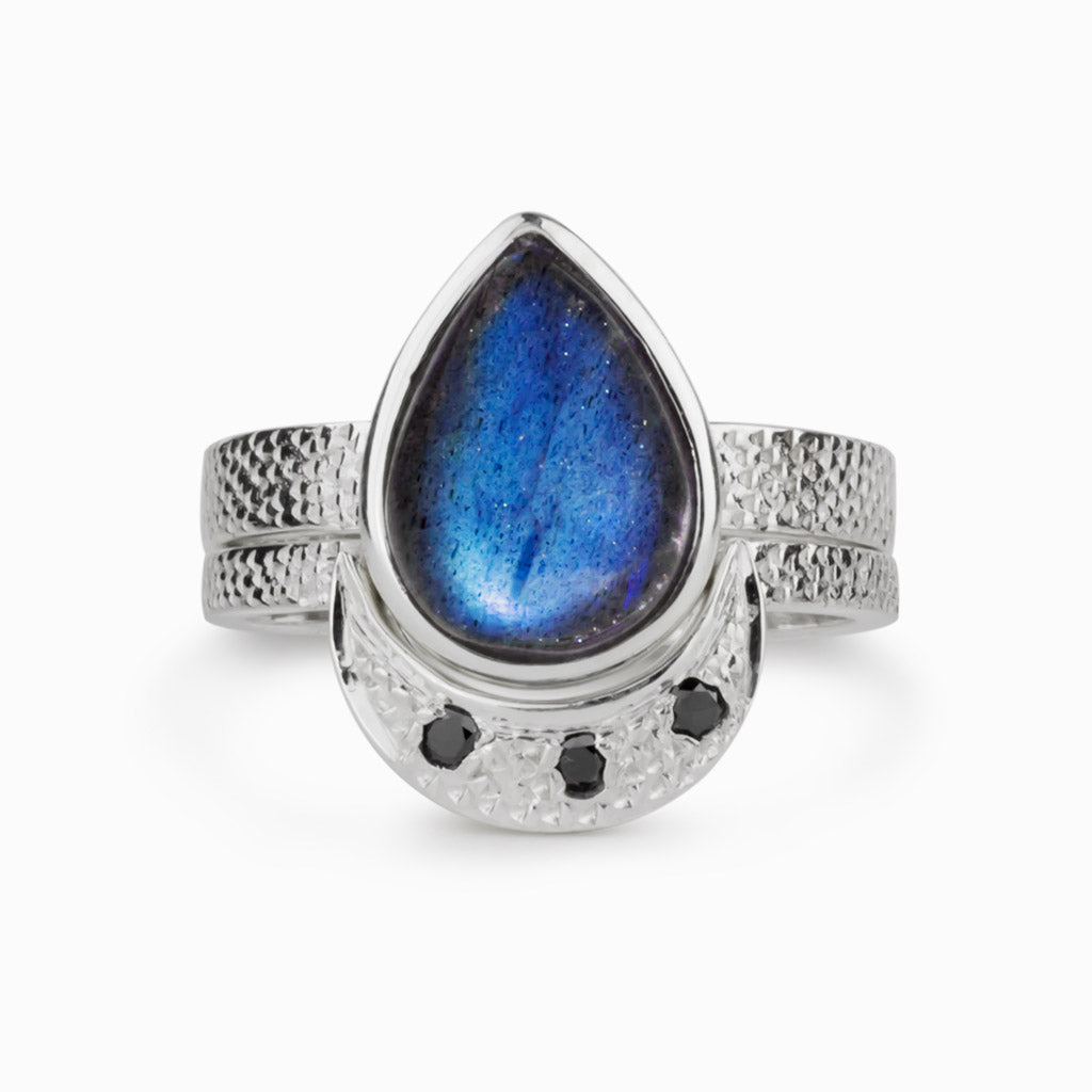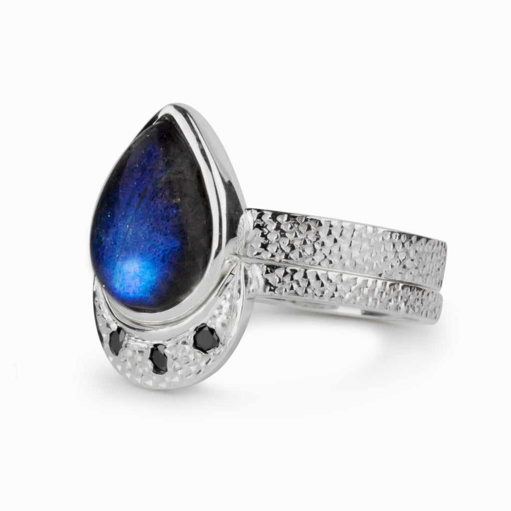 This gorgeous double, band ring has a stunning Labradorite gem that shines a vibrant blue. Paired with Black diamonds, this ring's properties promote originality and vitality.