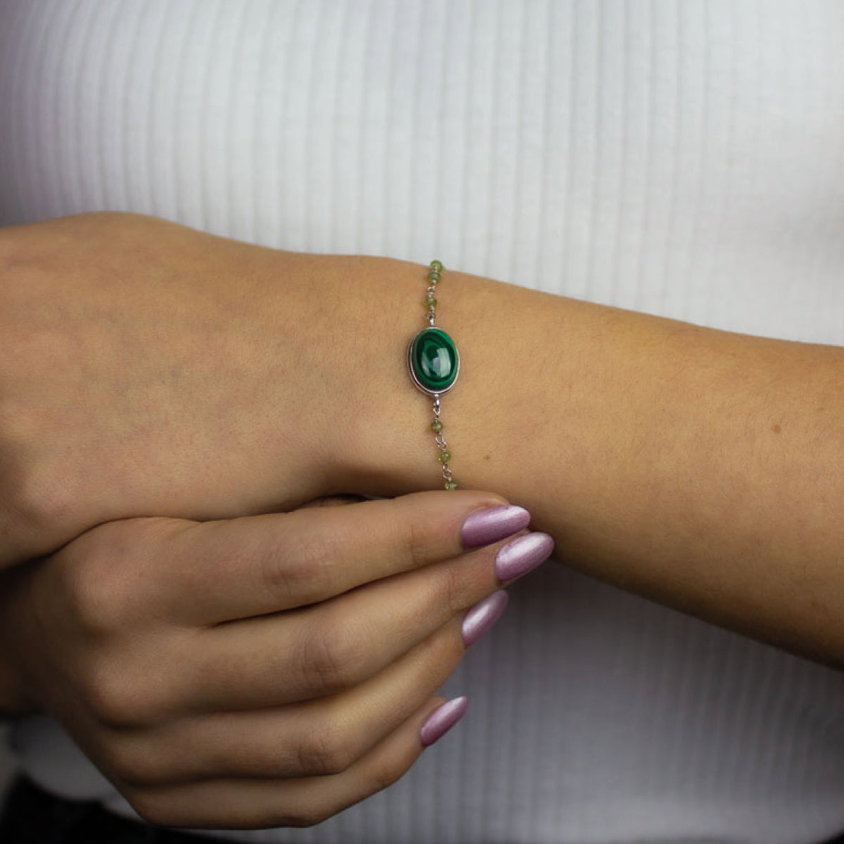 Wear this juicy, fresh green bracelet to add a touch of luxury to your look. Peridot emits a friendly and warm energy. Also known as the "gem of the sun," the Ancient Egyptians felt the warm glow of the sun's energy through the vivid, green glimmer. Peridot protects its wearer and is an excellent healing stone that helps one strengthen and regenerate the body and mind.