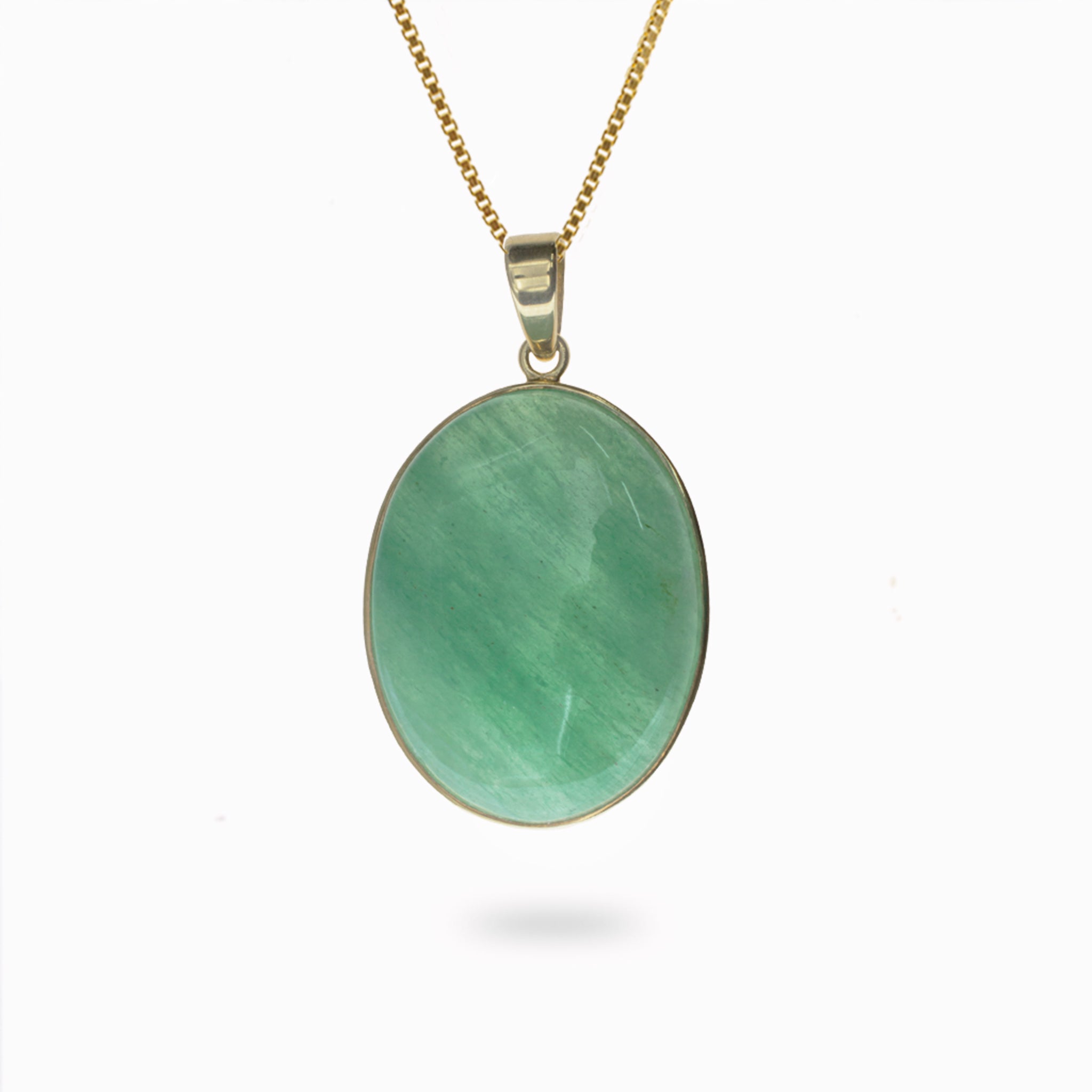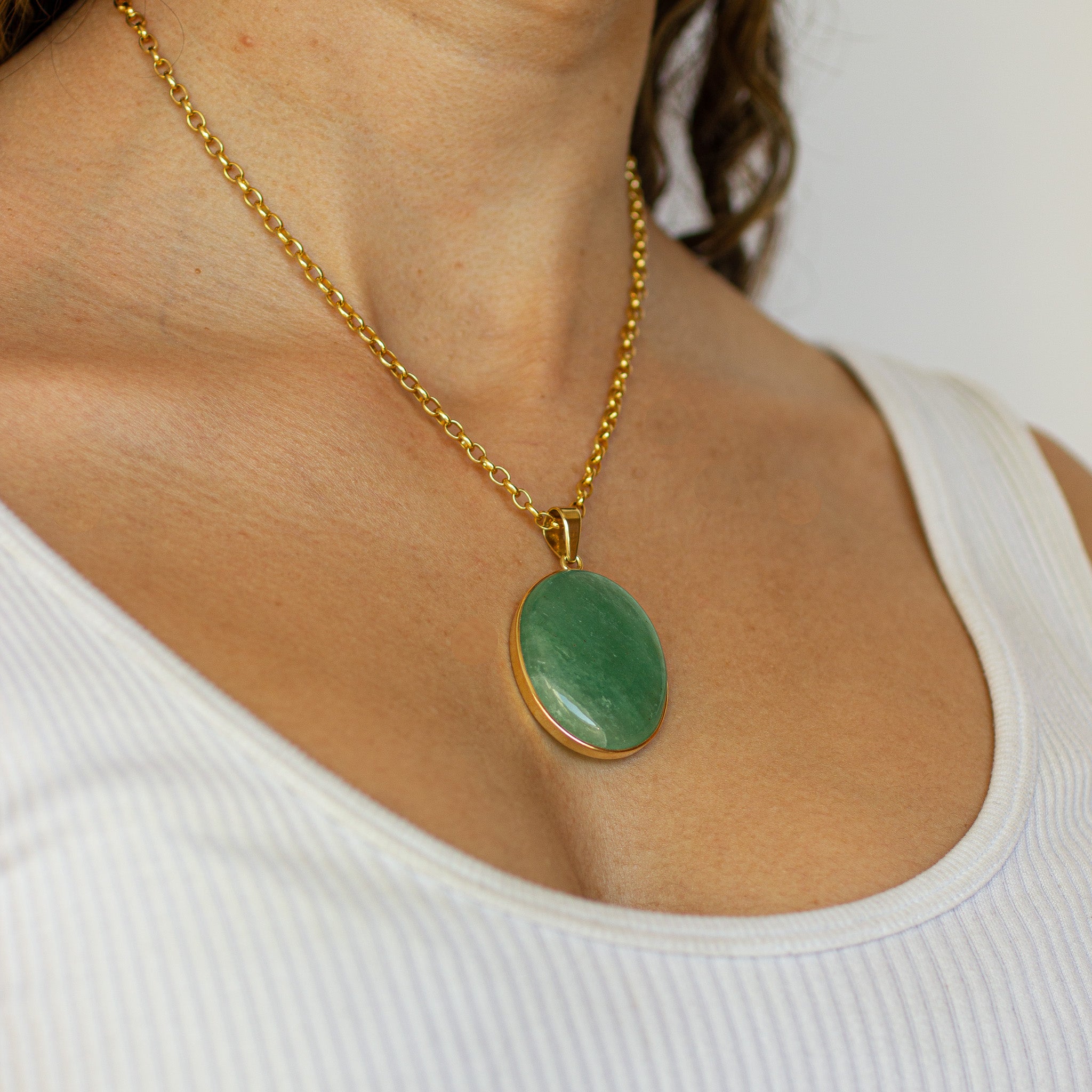 This beautiful cabochon oval necklace is a glittery Aventurine. This stone with brighten up your look and also protect your heart. The delicate, glittery green light of Aventurine will not only make you and your outfit shine bright but will protect your heart whilst doing so. The 14k yellow gold vermeil finish compliments the green tone beautifully, giving this necklace an elegant appearance.