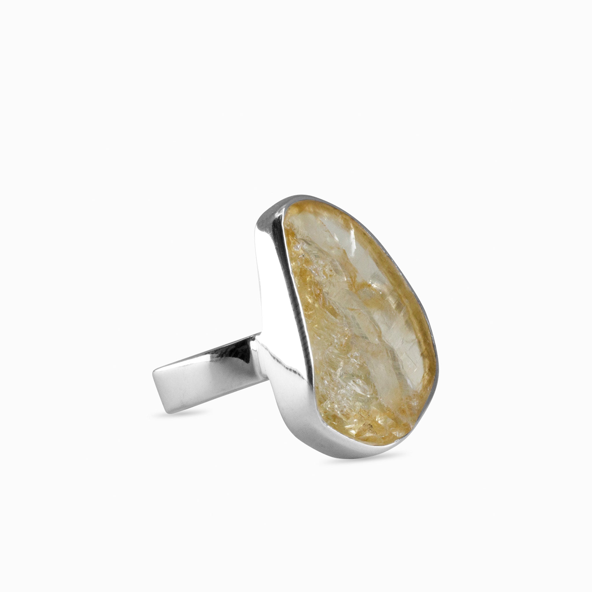 This warm yellow gemstone Citrine adds a unique touch to any outfit. This is the perfect interesting, one of a kind ring that works as a stunning casual statement piece. Stand out with this freeform, rough ring showing the natural colours of Citrine.