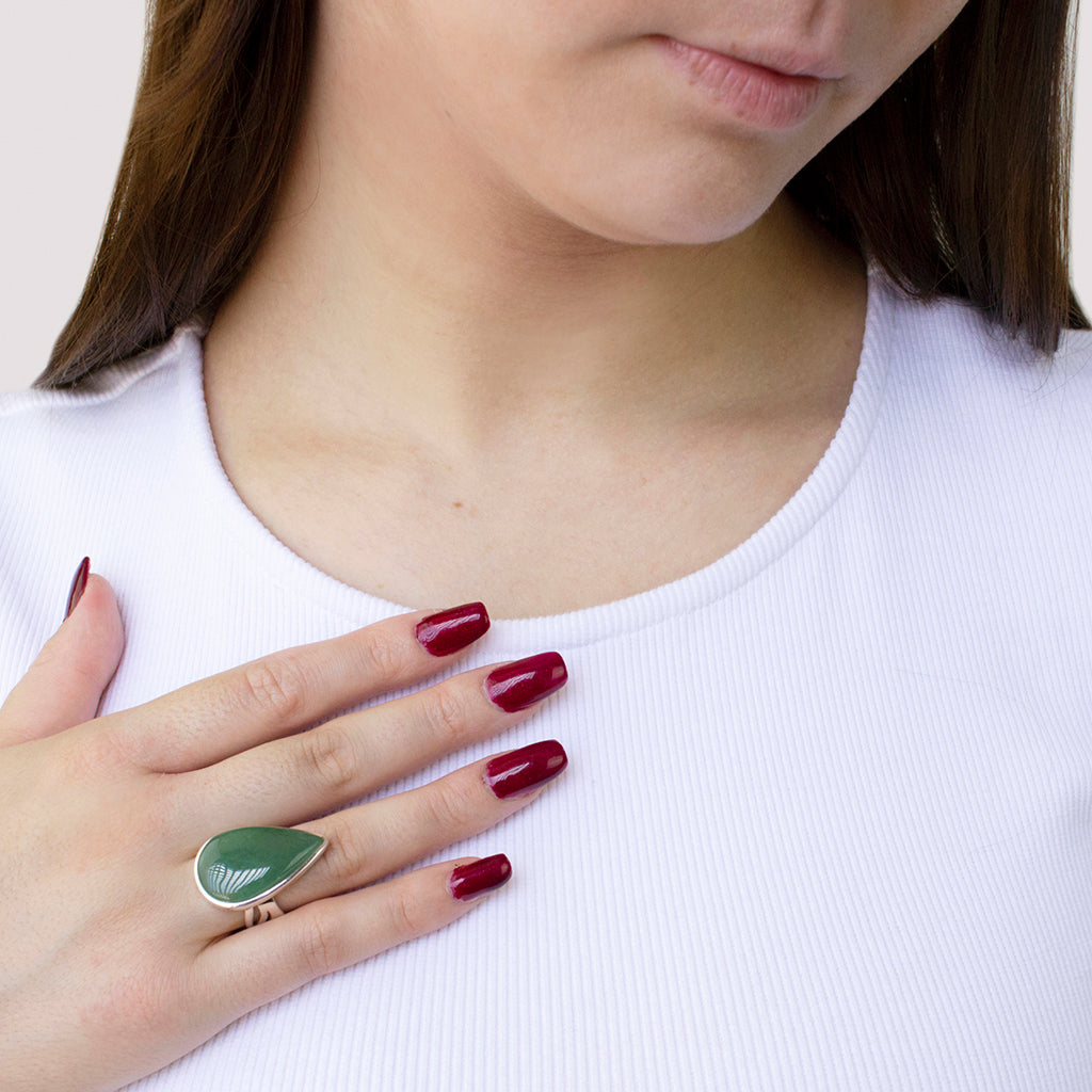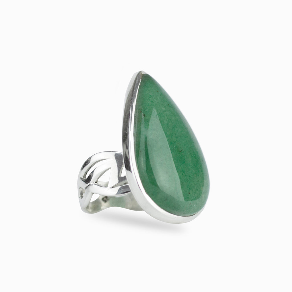 This beautiful teardrop green Aventurine ring has a classy cabochon cut, which allows a full view of the varied tones within the ring. Featuring a filigree band, this statement ring will add an amazing pop of colour to your outfits. Aventurine is often referred to as the "Stone of Opportunity" or the "Luckiest of all Crystals." It's believed to attract luck, prosperity, and abundance. Some people use it to manifest wealth or to increase opportunities for success in various endeavors. Also known as a stone for motivation, let this loving stone motivate you by enhancing creativity and decisiveness.