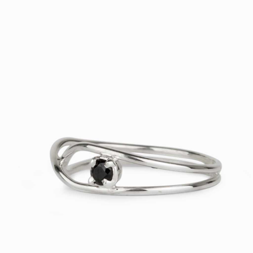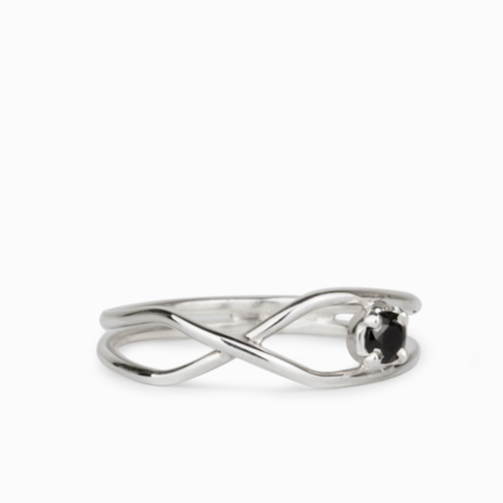 This dainty Black Onyx ring features a stunning faceted gemstone, inside a double band which swirls around decoratively. Black Onyx is believed to have grounding properties, helping individuals to stay focused and grounded, especially during times of stress or confusion.