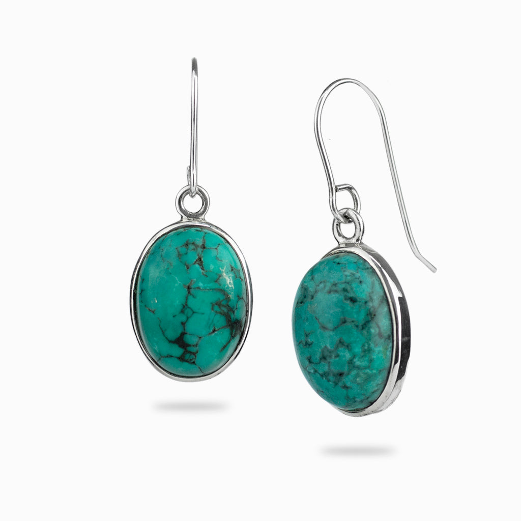 Featuring smooth cabochon Tibetan turquoise, these elegant oval drop earrings offer a touch of natural beauty.