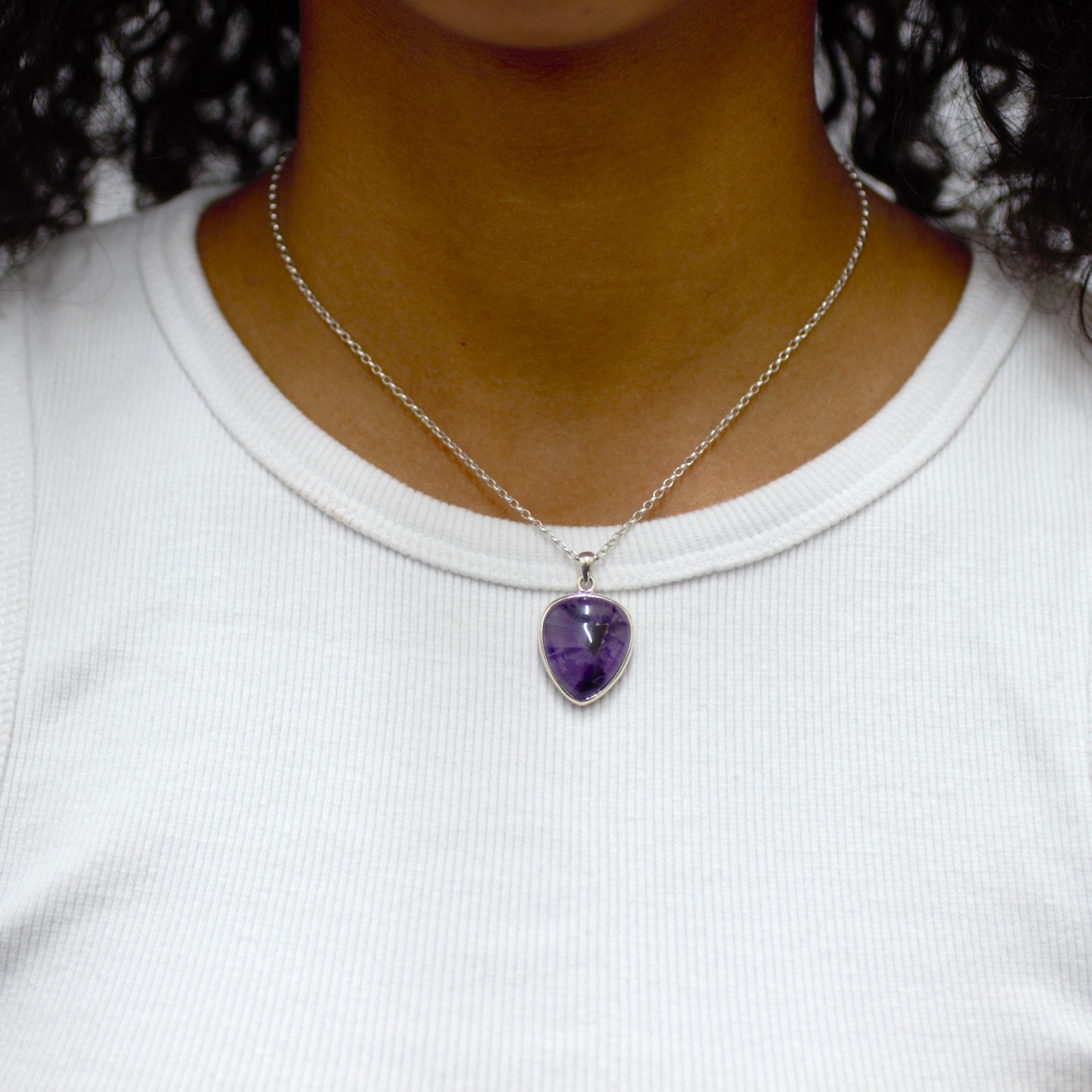 This stunning inverted teardrop cabochon Auralite necklace has a beautiful shine and a clear view of all the different tones within the necklace. This is a great way to add a pop of colour to your outfit. Auralite is a purple, transparent crystal that combines 23 earth elements and minerals. It is a fantastic instrument for spiritual healing and inner cleansing, and it is a perfect gem for stimulating all seven chakras. It assists one in focusing on their inner soul in order to appreciate the wealth that surrounds us.
