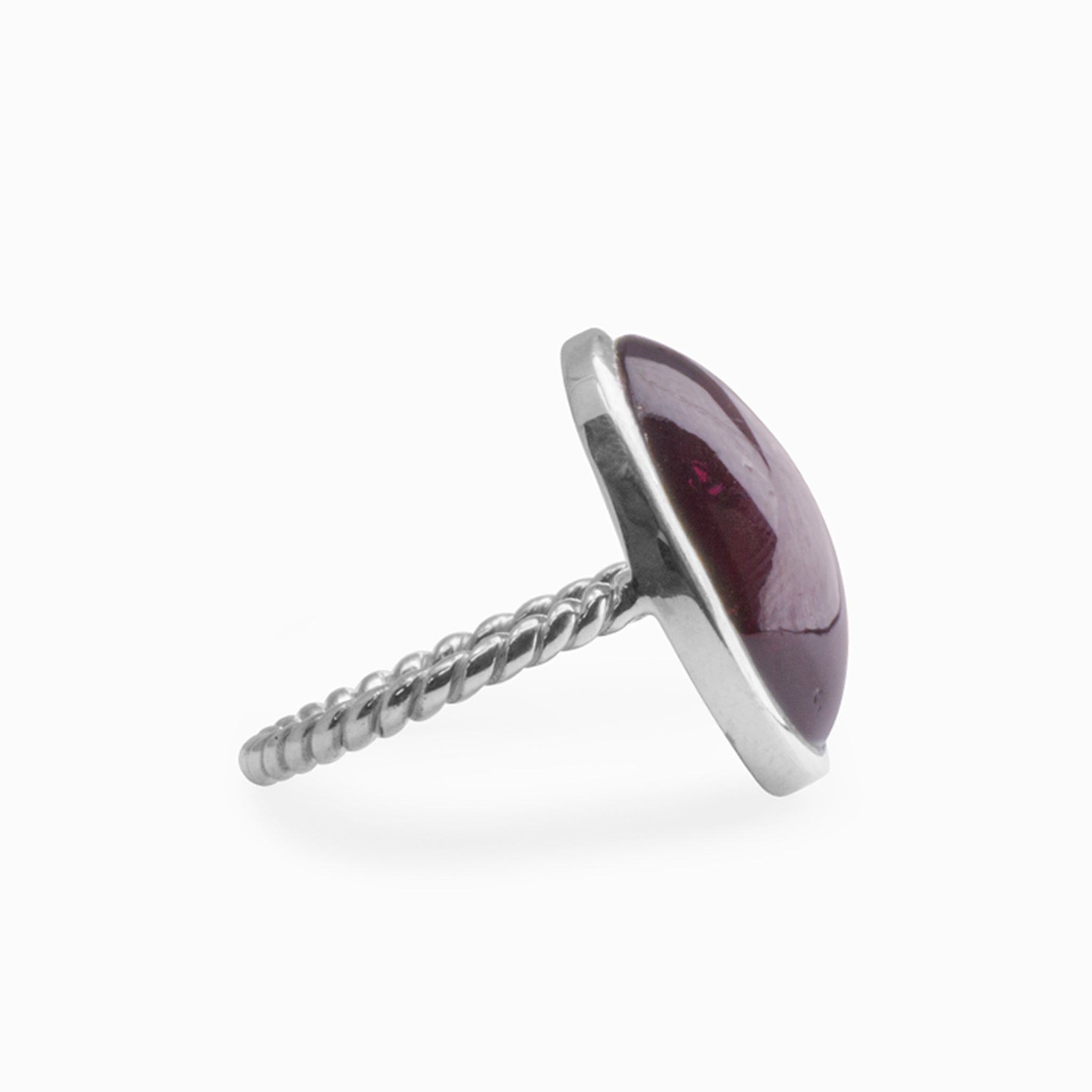 This gorgeous Almandine Garnet ring has an oval shape and bezel setting, with natural inclusions in the gemstone. The red-purple tones catch the light amazingly and the rope band adds a fine beautiful detail. Garnet is renowned as the "stone of health" because it absorbs bad energy from your chakras and changes it into positive energy. Garnet is also regarded as the "stone of commitment," as it helps you devote yourself to a cause, others, and yourself.