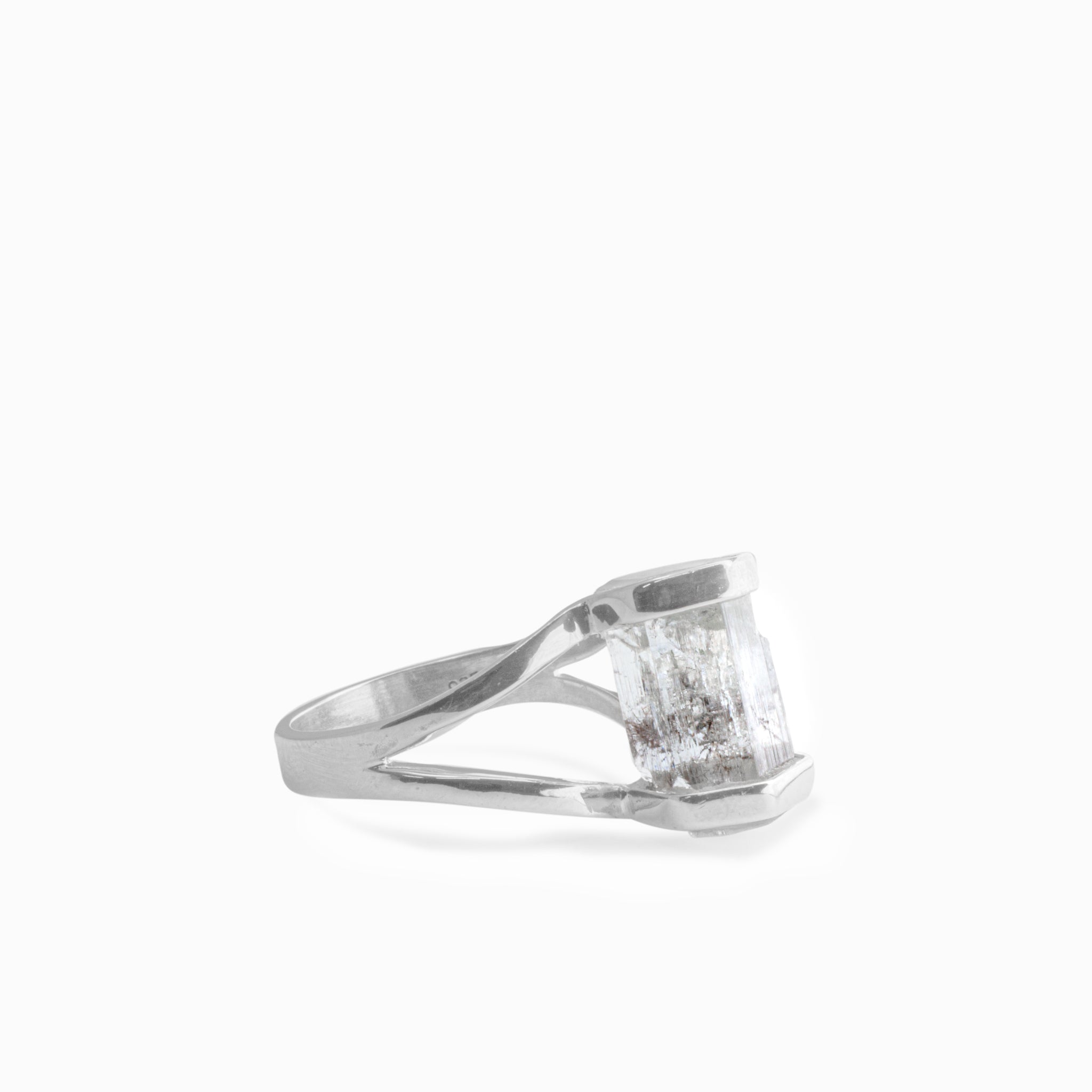 This pencil belt ring is an icy Aquamarine with Black Tourmaline in it, with a split band to add a unique element. This sparkling beauty is appreciated for its calming, soothing, and cleansing properties. This jewel, often known as the "bravery stone," enhances one's ability to "always be prepared." Aquamarine stimulates, activates, and cleanses the throat chakra, inspiring honesty, trust, and letting go. This subtle bling will empower you to speak your truth and claim who you are in every situation.