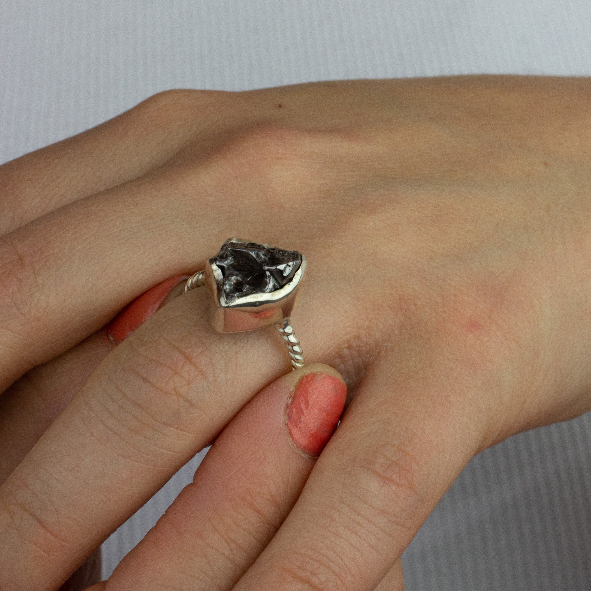 This meteorite, Campo Del Cielo was believed to have collided with Earth over 4,000 years ago. It visually conveys the velocity of its arrival with raw organic edges. This freeform, bezel set ring is meant to be beneficial for connecting with former lives as well as meditation and visualisation.