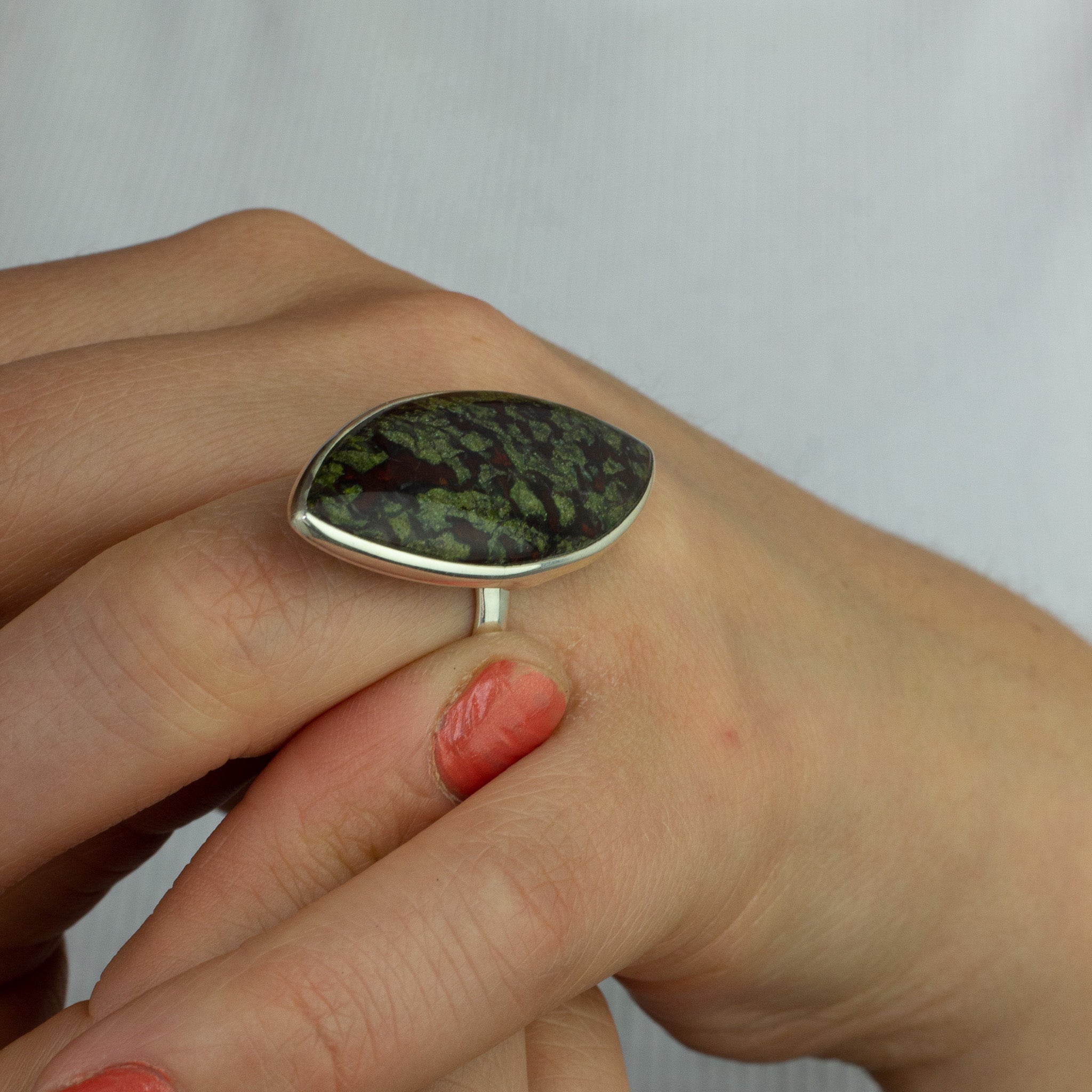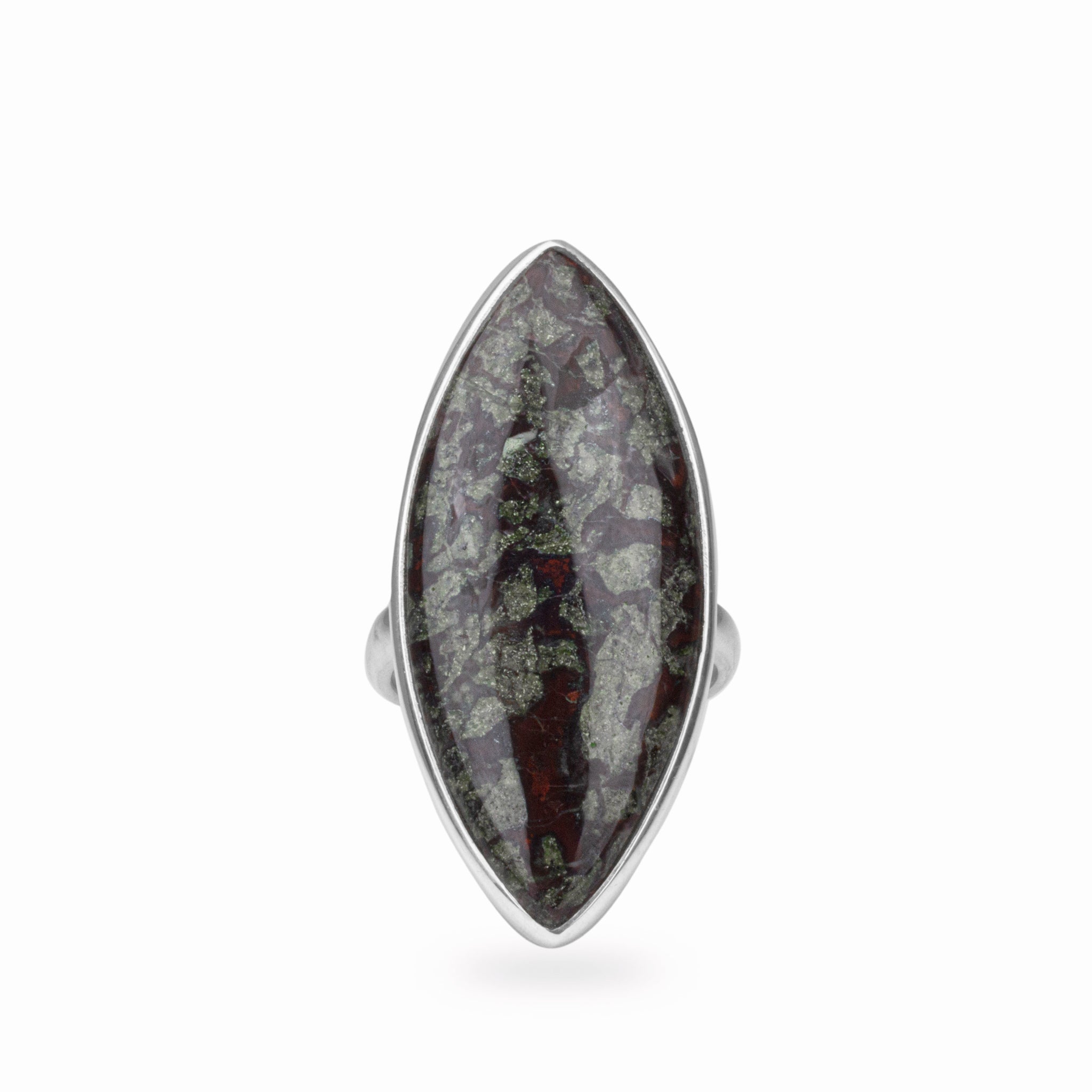The blood-red splashes that give this mineral its enigmatic name are reminiscent of a legendary green and leathery-skinned creature. When it comes to putting together the perfect outfit, this patterned, coloured ring gives you some leeway. This stone encourages one to stay present and "keep on keeping on," thereby removing old impediments.