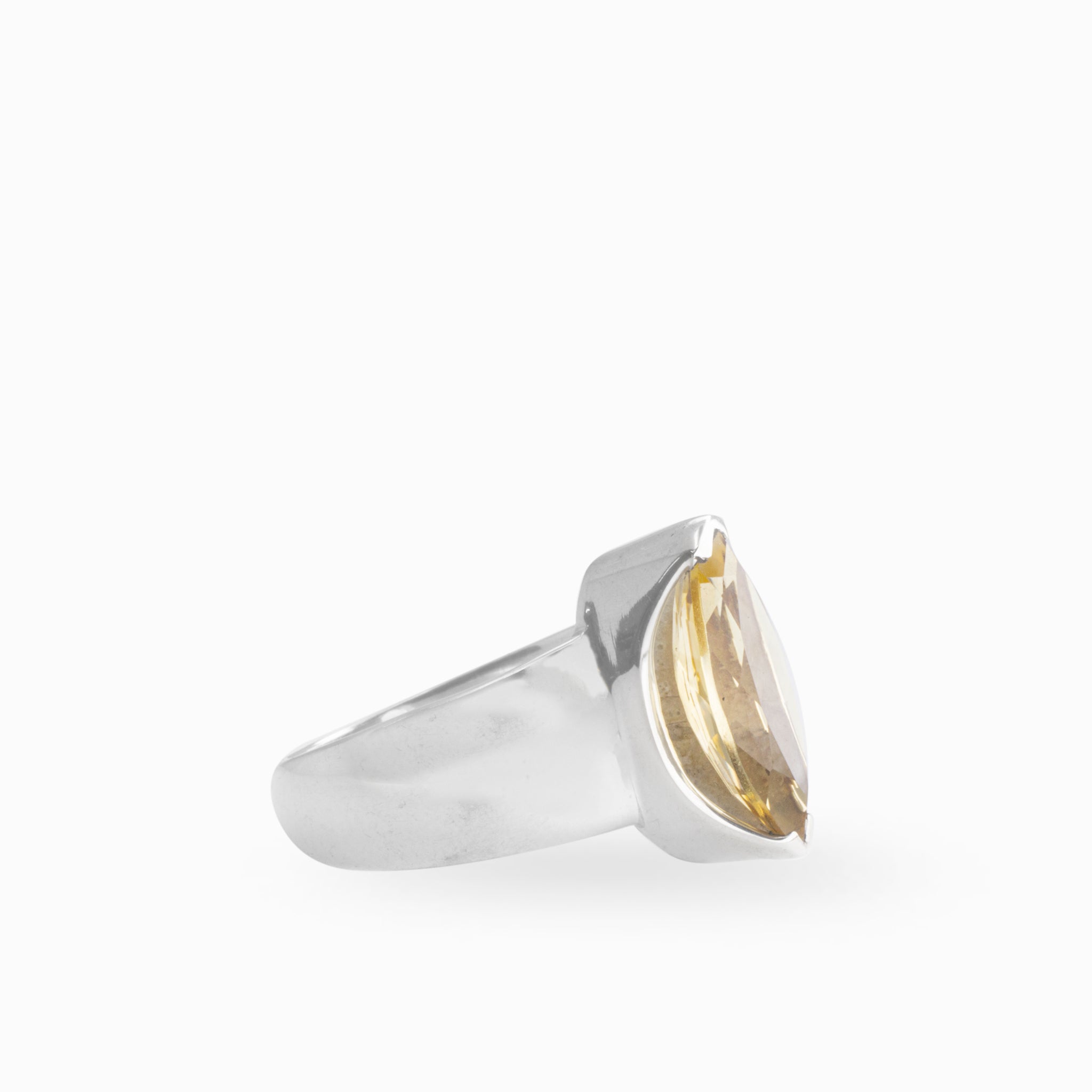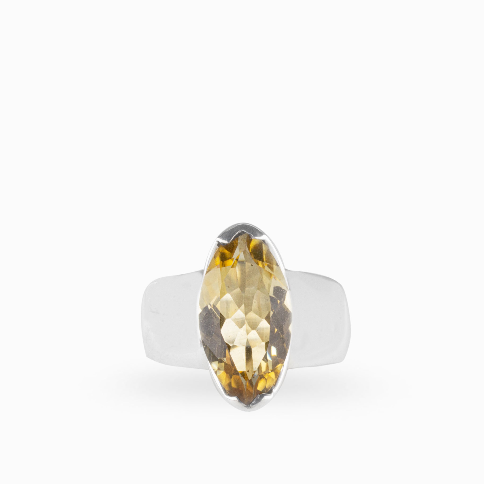 This marquise shaped, faceted Citrine ring has a stunning warm yellow glow.