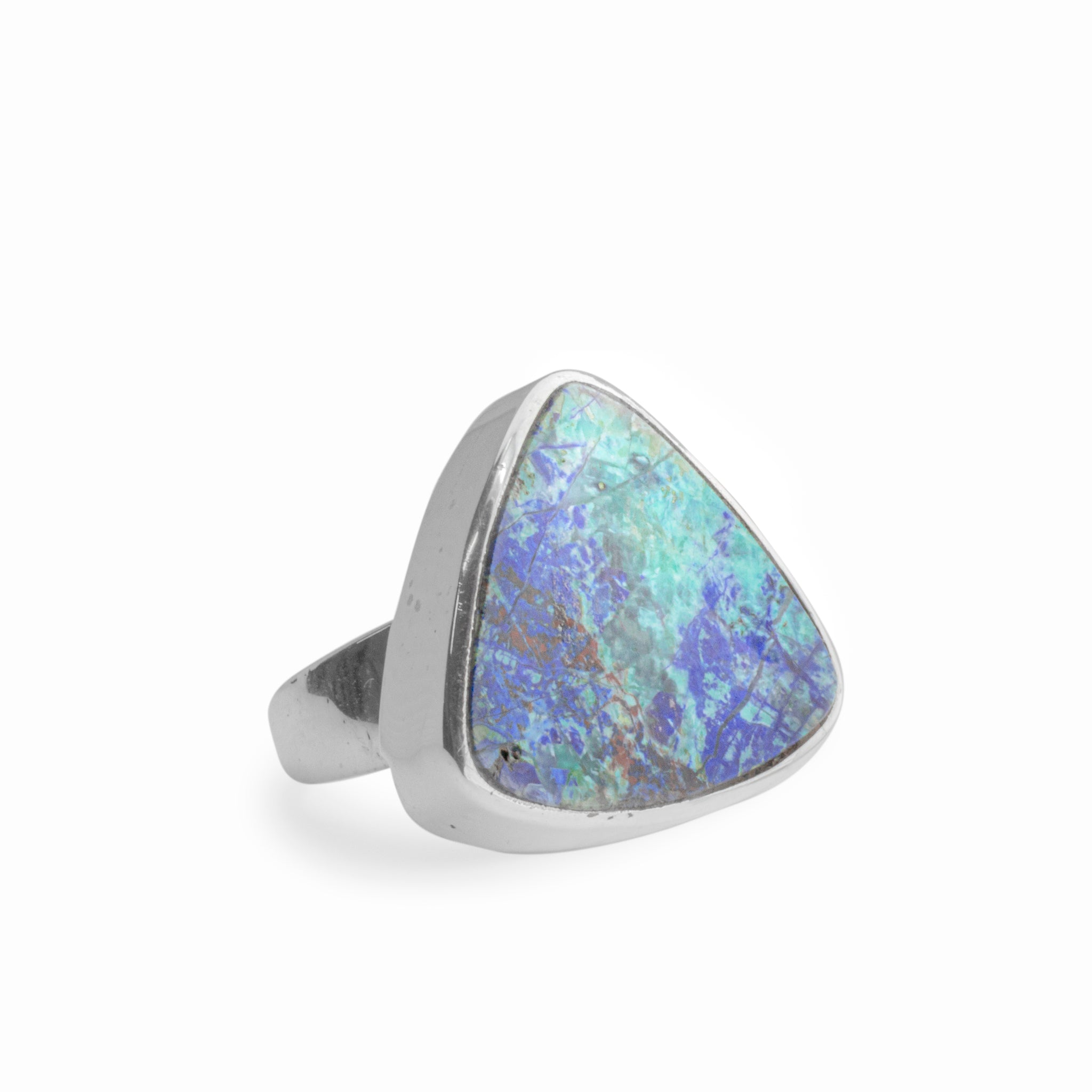 This beautiful triangular Azurite Turquoise ring has a stunning natural, intricate pattern, featuring bright blue, pale green and soft white. This is the perfect piece to add a hint of colour to your outfits. The gemstone's name refers to the deep azure-blue of the Mediterranean Sea. Wear Azurite Turquoise to increase your self-esteem and bring your chakras into alignment.