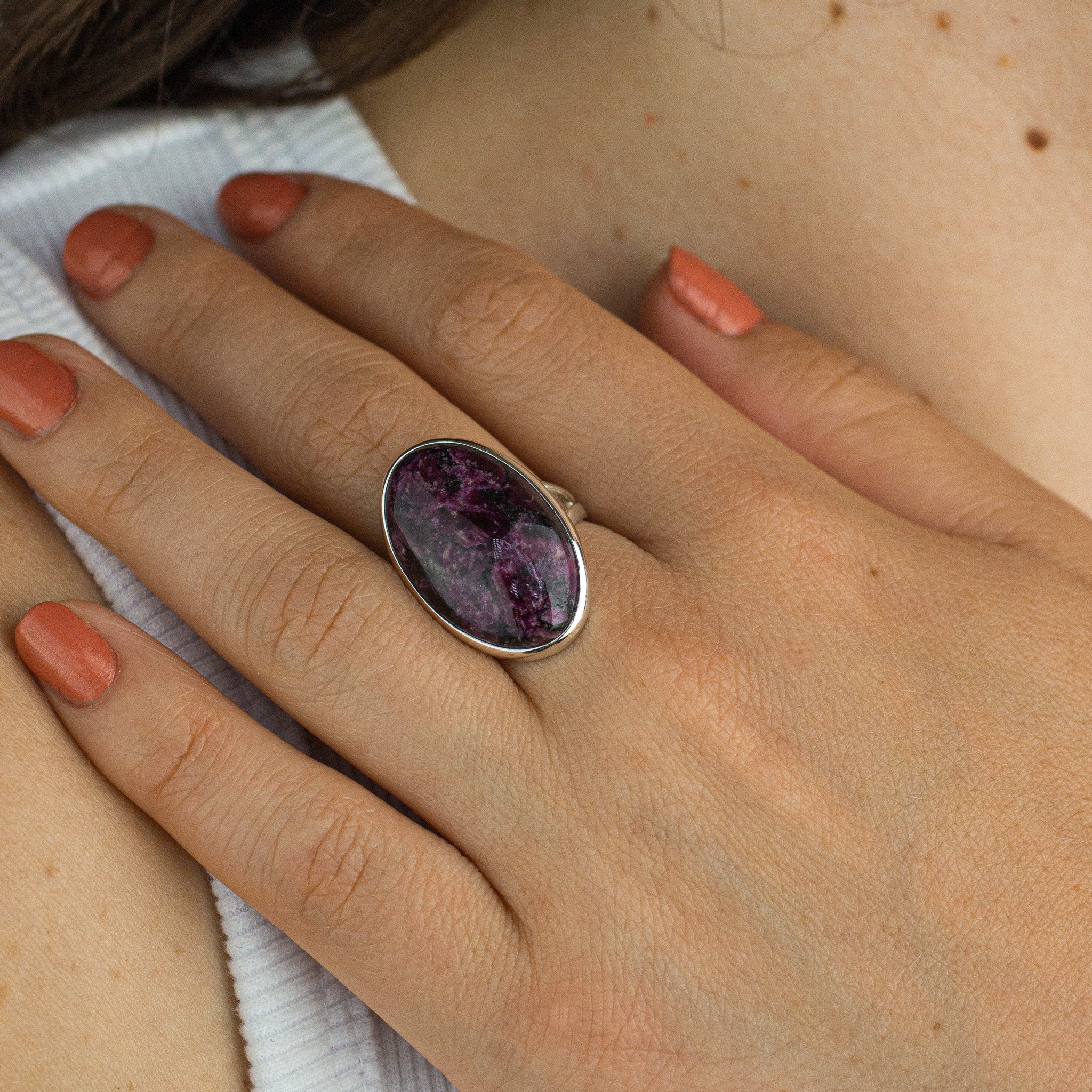 The "stone of the heart land," a magnificent pinky-red gemstone with contrasting greens and blacks, Eudialyte awakens the heart chakra, fine-tuning one's self-love. Wear this beautiful ring to share the love! By integrating the emotional body and intellect, Eudialyte instils inspiration and confidence in one's life. When this mineral is worn or held, energy flows from the crown chakra to the base chakra, opening the chakras and allowing Kundalini, a type of pure feminine energy, to flow freely.