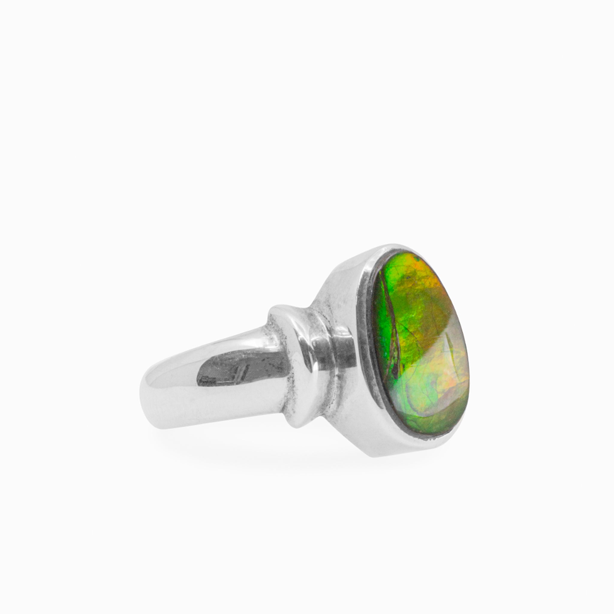 With its spectacular display of iridescent colours, this timeless gemstone ring is sure to brighten any day. This oval ring is bezel set in an interesting decorative thick band and the colours flick between a fire red and a neon green. This organic and extremely rare gemstone is cut from the fossilised shells of extinct marine creatures from millions of years past, called ammonites. Wear this magnificent piece to add a majestic pop to any outfit and style. This stone is helpful for protection, stability, survival as well as great meditative stone for wellbeing. Keep this stone close to attract good luck and financial prosperity.